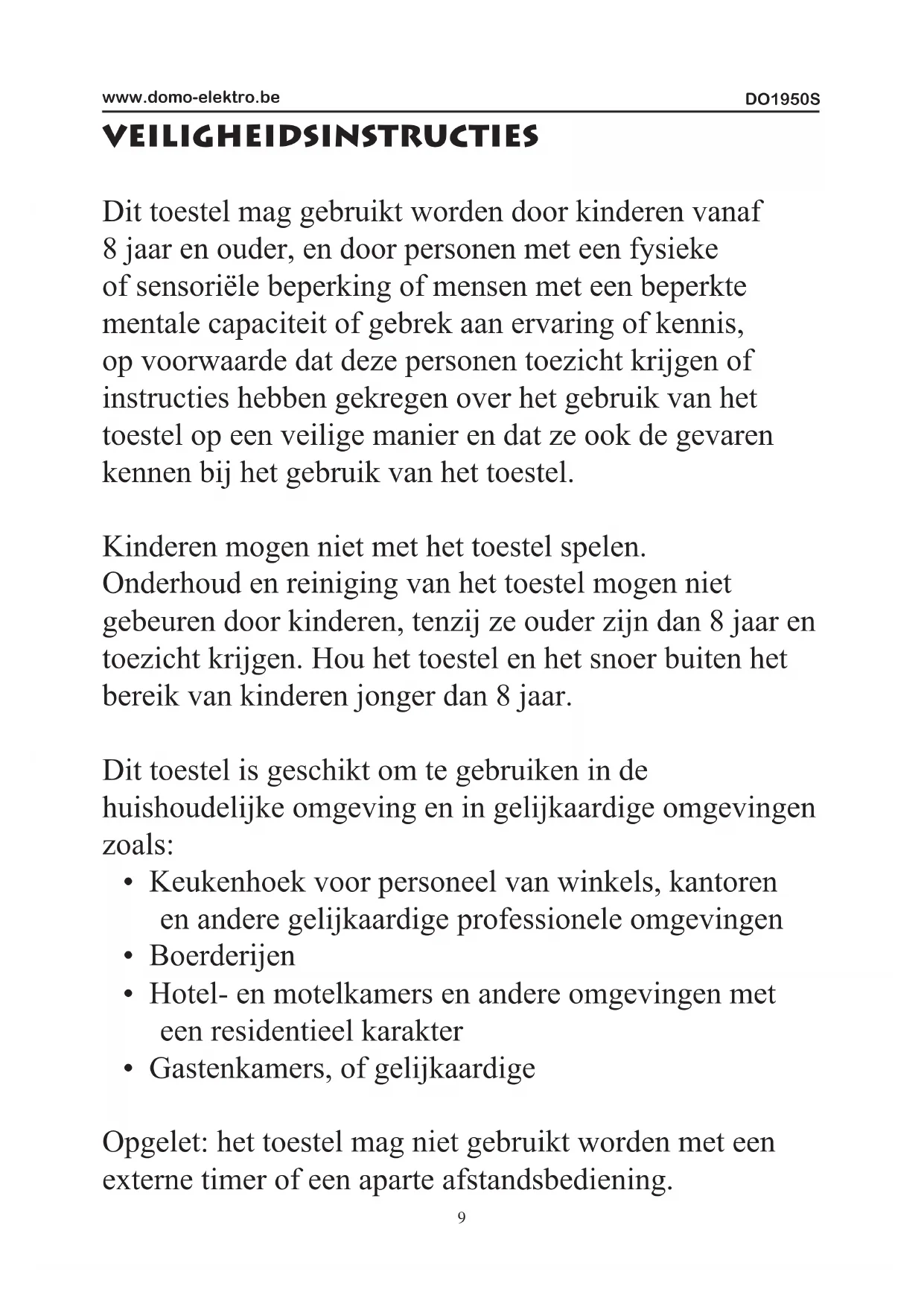 www.domo-elektro.be VEILIGHEIDSINSTRUCTIES Dit toestel mag gebruikt worden door kinderen vanaf 8 jaar en ouder, en door personen met een fysieke of sensoriële beperking of mensen met een beperkte mentale capaciteit of gebrek aan ervaring of kennis, op voorwaarde dat deze personen toezicht krijgen of instructies hebben gekregen over het gebruik van het toestel op een veilige manier en dat ze ook de gevaren kennen bij het gebruik van het toestel. Kinderen mogen niet met het toestel spelen. Onderhoud en reiniging van het toestel mogen niet gebeuren door kinderen, tenzij ze ouder zijn dan 8 jaar en toezicht krijgen. Hou het toestel en het snoer buiten het bereik van kinderen jonger dan 8 jaar. Dit toestel is geschikt om te gebruiken in de huishoudelijke omgeving en in gelijkaardige omgevingen zoals: