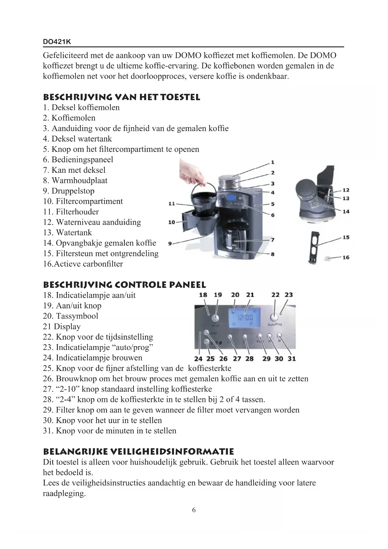 5DO421K Gefeliciteerd met de aankoop van uw DOMO kofezet met kofemolen. De DOMO