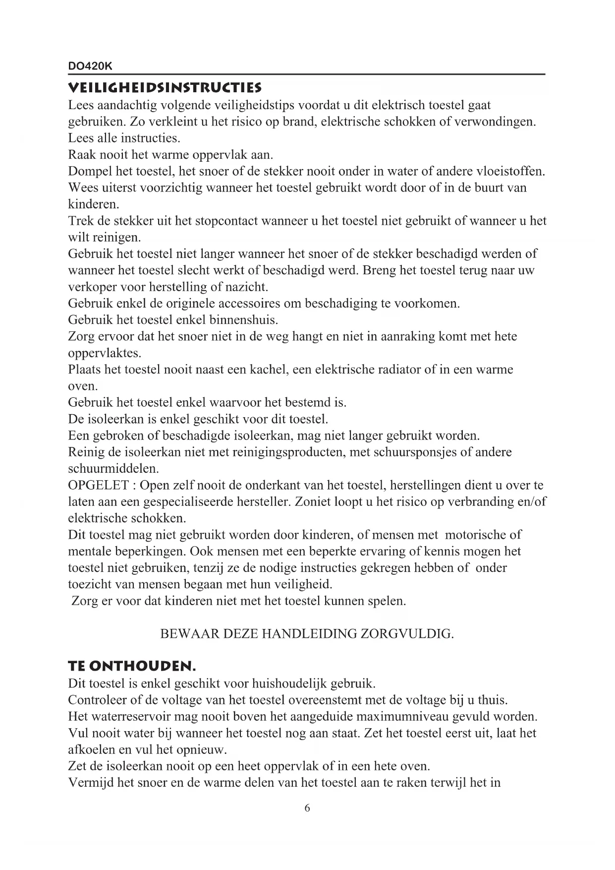 5DO420K VEILIGHEIDSINSTRUCTIES Lees aandachtig volgende veiligheidstips voordat u dit elektrisch toestel gaat
