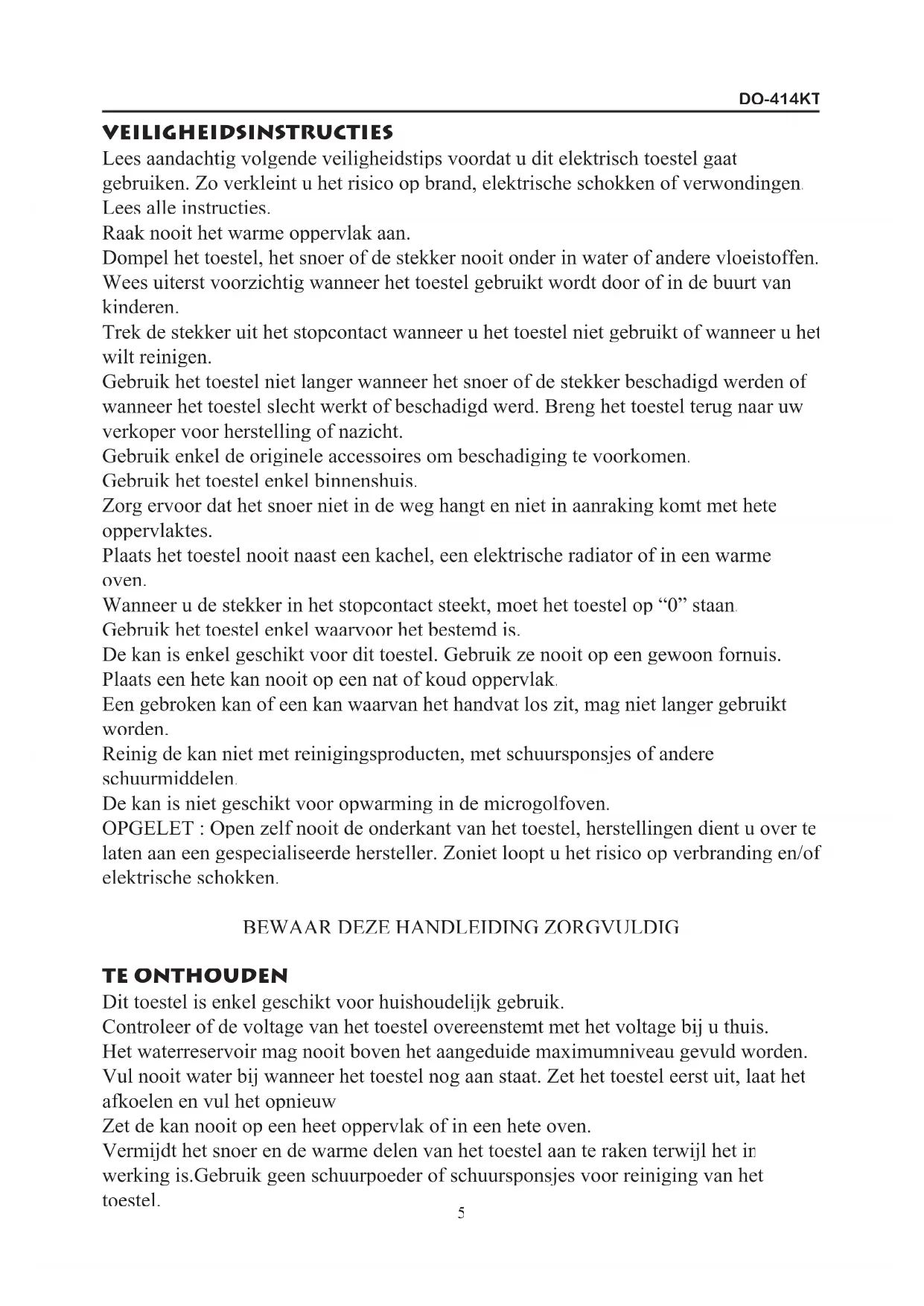 the shop where you purchased the product.DO-414KT VEILIGHEIDSINSTRUCTIES Lees aandachtig volgende veiligheidstips voordat u dit elektrisch toestel gaat