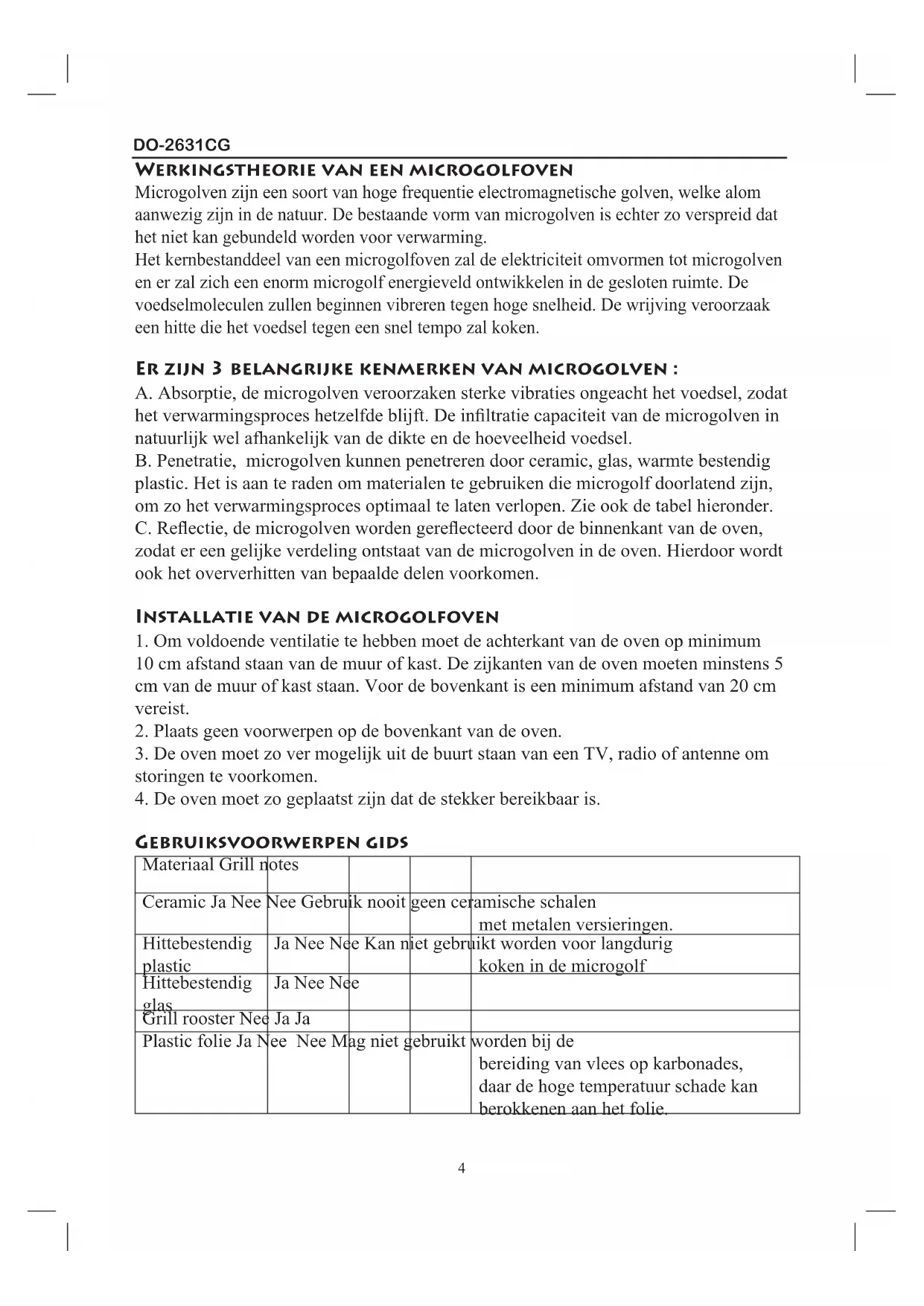 Gebruiksvoorwerpen gids Materiaal Grill notes Ceramic Ja Nee Nee Gebruik nooit geen ceramische schalen met metalen versieringen. Hittebestendig plastic Ja Nee Nee Kan niet gebruikt worden voor langdurig koken in de microgolf Hittebestendig glas Ja Nee Nee Grill rooster Nee Ja Ja Plastic folie Ja Nee Nee Mag niet gebruikt worden bij de bereiding van vlees op karbonades, daar de hoge temperatuur schade kan berokkenen aan het folie.DO-2631CG