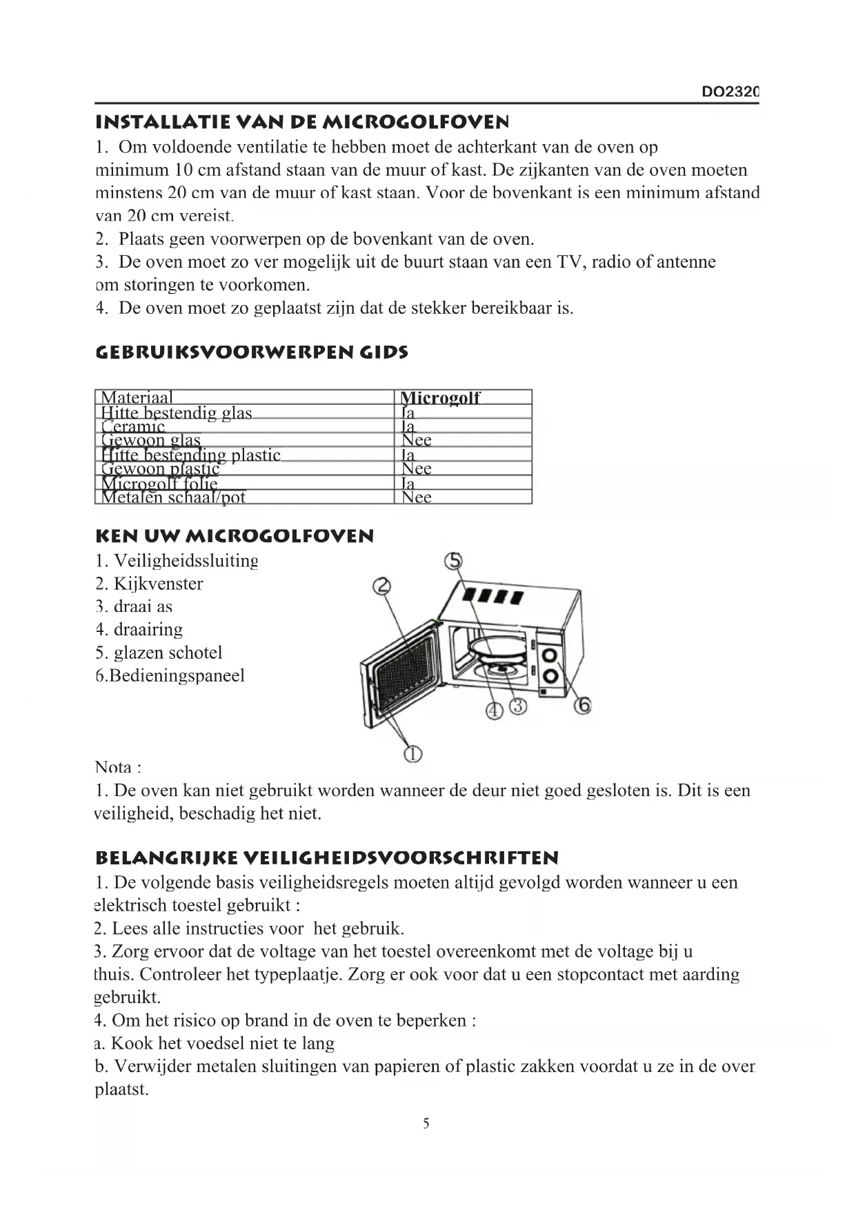 a. Kook het voedsel niet te lang b. Verwijder metalen sluitingen van papieren of plastic zakken voordat u ze in de oven plaatst. 5DO2320 c. Verwarm geen frituurolie of vet, de temperatuur van de olie kan niet gecontroleerd worden. d. Maak de microgolfgeleider schoon na ieder gebruik. Veeg hem eerst schoon met een vochtige doek, gevolgd door een droog doek om voedselresten of vet te verwijderen. Opgehoopt vet kan oververhit raken en beginnen te roken of zelfs vuur vatten. e. Wanneer materiaal in de oven zou beginnen te roken of vuur vatten, moet u de ovendeur gesloten houden, het toestel uitzetten en de stekker uit het stopcontact verwijderen. f. Nauwgezet toezicht is nodig wanneer u gebruik maakt van wegwerp schalen gemaakt van plastic, papier of ander lichtontvlambaar materiaal.