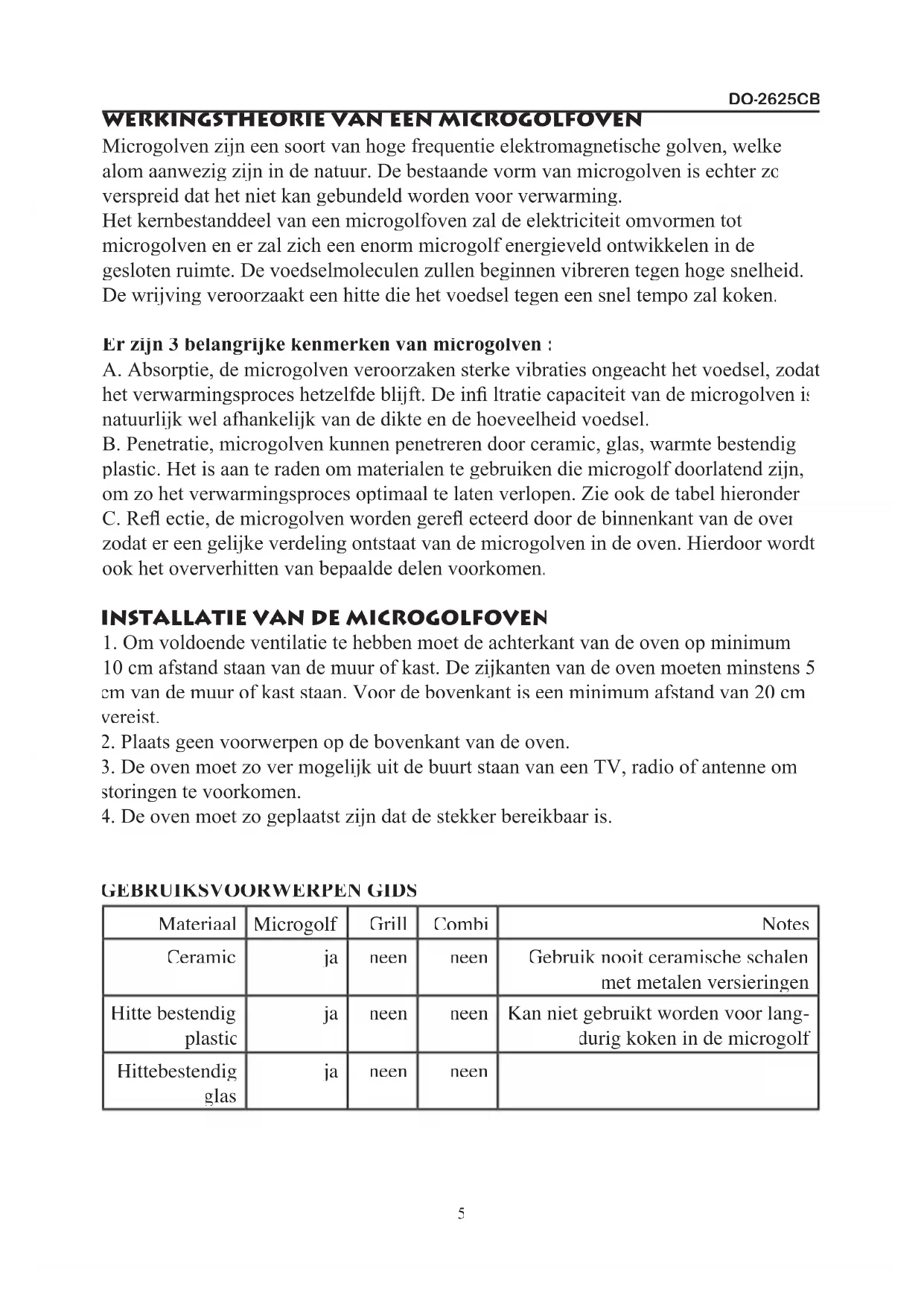 Microgolven zijn een soort van hoge frequentie elektromagnetische golven, welke alom aanwezig zijn in de natuur. De bestaande vorm van microgolven is echter zo verspreid dat het niet kan gebundeld worden voor verwarming. Het kernbestanddeel van een microgolfoven zal de elektriciteit omvormen tot microgolven en er zal zich een enorm microgolf energieveld ontwikkelen in de gesloten ruimte. De voedselmoleculen zullen beginnen vibreren tegen hoge snelheid. De wrijving veroorzaakt een hitte die het voedsel tegen een snel tempo zal koken. Er zijn 3 belangrijke kenmerken van microgolven : A. Absorptie, de microgolven veroorzaken sterke vibraties ongeacht het voedsel, zodat het verwarmingsproces hetzelfde blijft. De infi ltratie capaciteit van de microgolven is natuurlijk wel afhankelijk van de dikte en de hoeveelheid voedsel. B. Penetratie, microgolven kunnen penetreren door ceramic, glas, warmte bestendig plastic. Het is aan te raden om materialen te gebruiken die microgolf doorlatend zijn, om zo het verwarmingsproces optimaal te laten verlopen. Zie ook de tabel hieronder. C. Refl ectie, de microgolven worden gerefl ecteerd door de binnenkant van de oven, zodat er een gelijke verdeling ontstaat van de microgolven in de oven. Hierdoor wordt ook het oververhitten van bepaalde delen voorkomen.