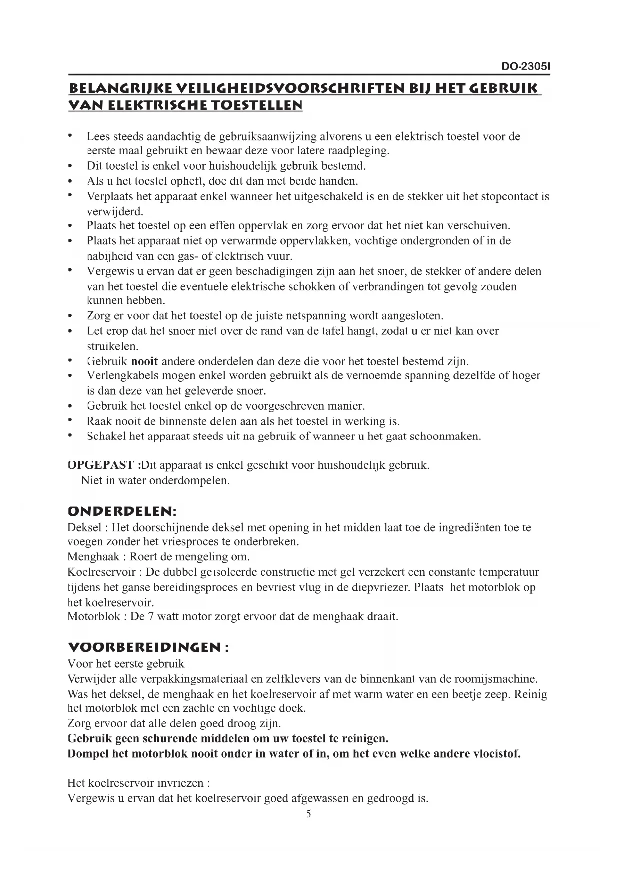 HANDLEIDING MODE D’EMPLOI GEBRAUCHANLEITUNG INSTRUCTION BOOKLET PRODUCT OF ROOM IJSMACHINE SORBETI ERE EISCREMEMA SCHINE ICE CREAM MAKER DO-2305IDO-2305I GARANTIEVOORWAARDEN Dit apparaat heeft een garantietermijn van 2 jaar vanaf de datum van aankoop.