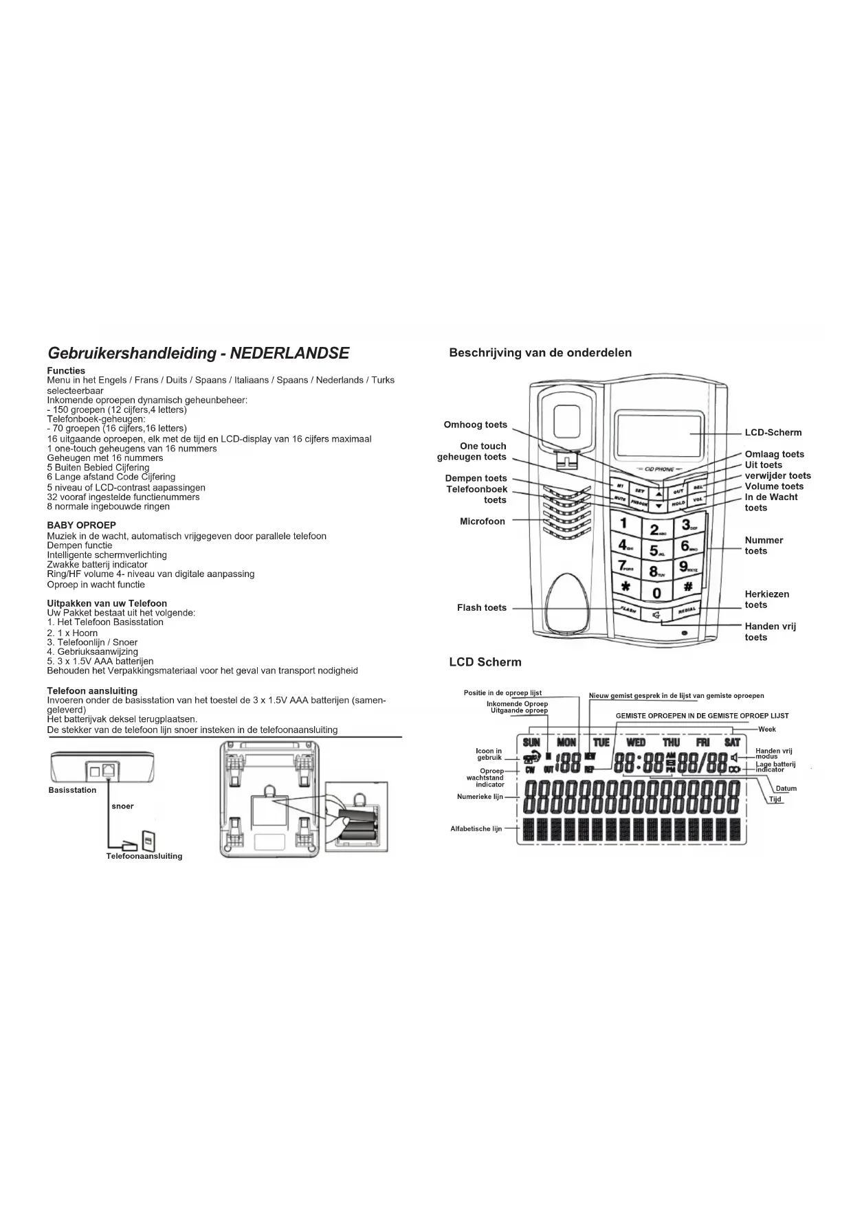- Togliere le batterie dal’apparecchio quando questo non viene usato per un lungo periodo manuale big 200.indd 18-19 30/05/12 13.52Gebruikershandleiding - NEDERLANDSE Basisstation snoer Telefoonaansluiting Functies Menu in het Engels / Frans / Duits / Spaans / Italiaans / Spaans / Nederlands / Turks selecteerbaar Inkomende oproepen dynamisch geheunbeheer: - 150 groepen (12 cijfers,4 letters) Telefonboek-geheugen: - 70 groepen (16 cijfers,16 letters) 16 uitgaande oproepen, elk met de tijd en LCD-display van 16 cijfers maximaal 1 one-touch geheugens van 16 nummers Geheugen met 16 nummers 5 Buiten Bebied Cijfering 6 Lange afstand Code Cijfering 5 niveau of LCD-contrast aapassingen 32 vooraf ingestelde functienummers 8 normale ingebouwde ringen BABY OPROEP Muziek in de wacht, automatisch vrijgegeven door parallele telefoon Dempen functie Intelligente schermverlichting Zwakke batterij indicator Ring/HF volume 4- niveau van digitale aanpassing Oproep in wacht functie Uitpakken van uw Telefoon Uw Pakket bestaat uit het volgende:
