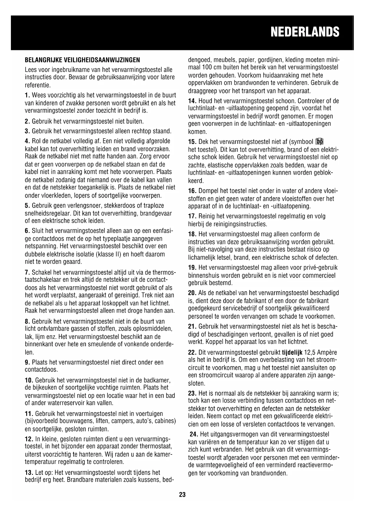 22. Dit verwarmingstoestel gebruikt tijdelijk 12,5 Ampère