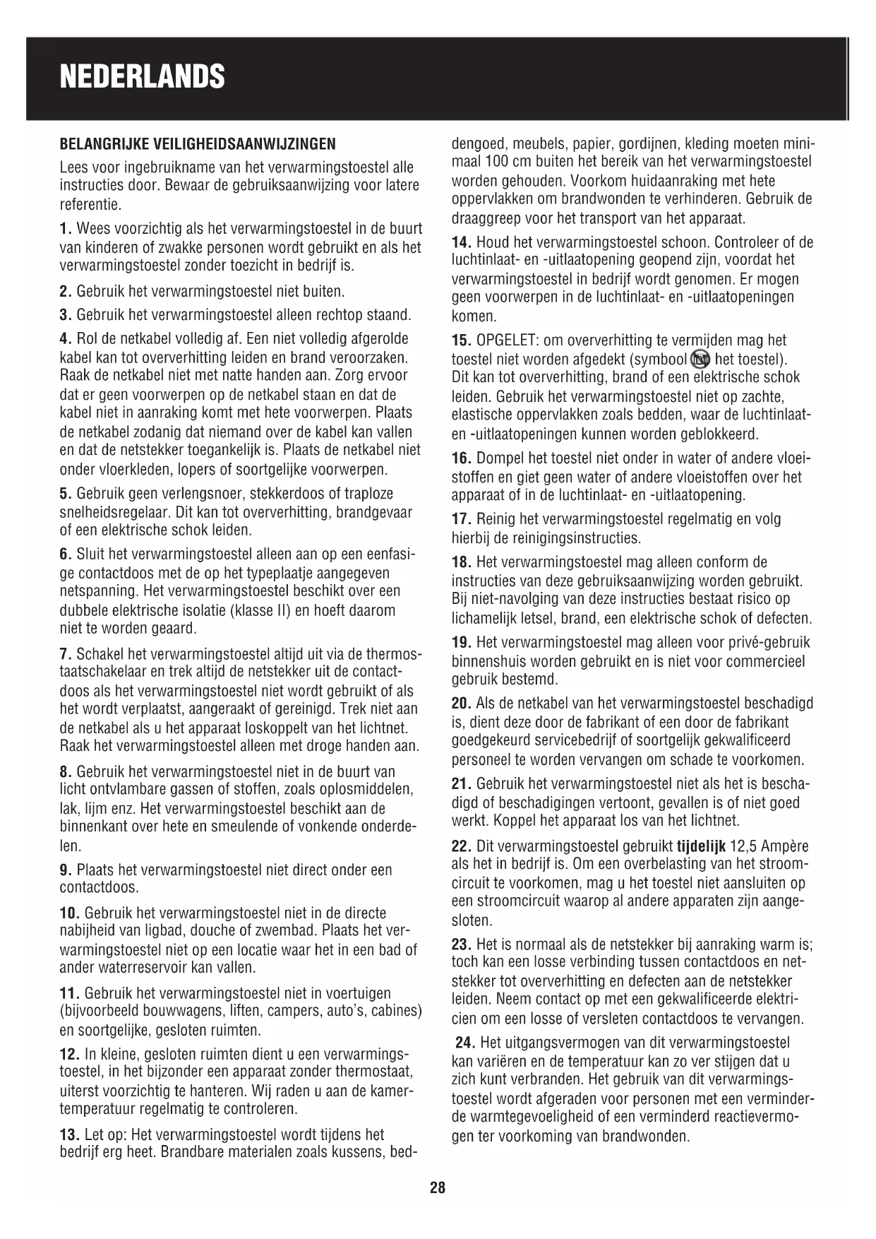 22. Dit verwarmingstoestel gebruikt tijdelijk 12,5 Ampère