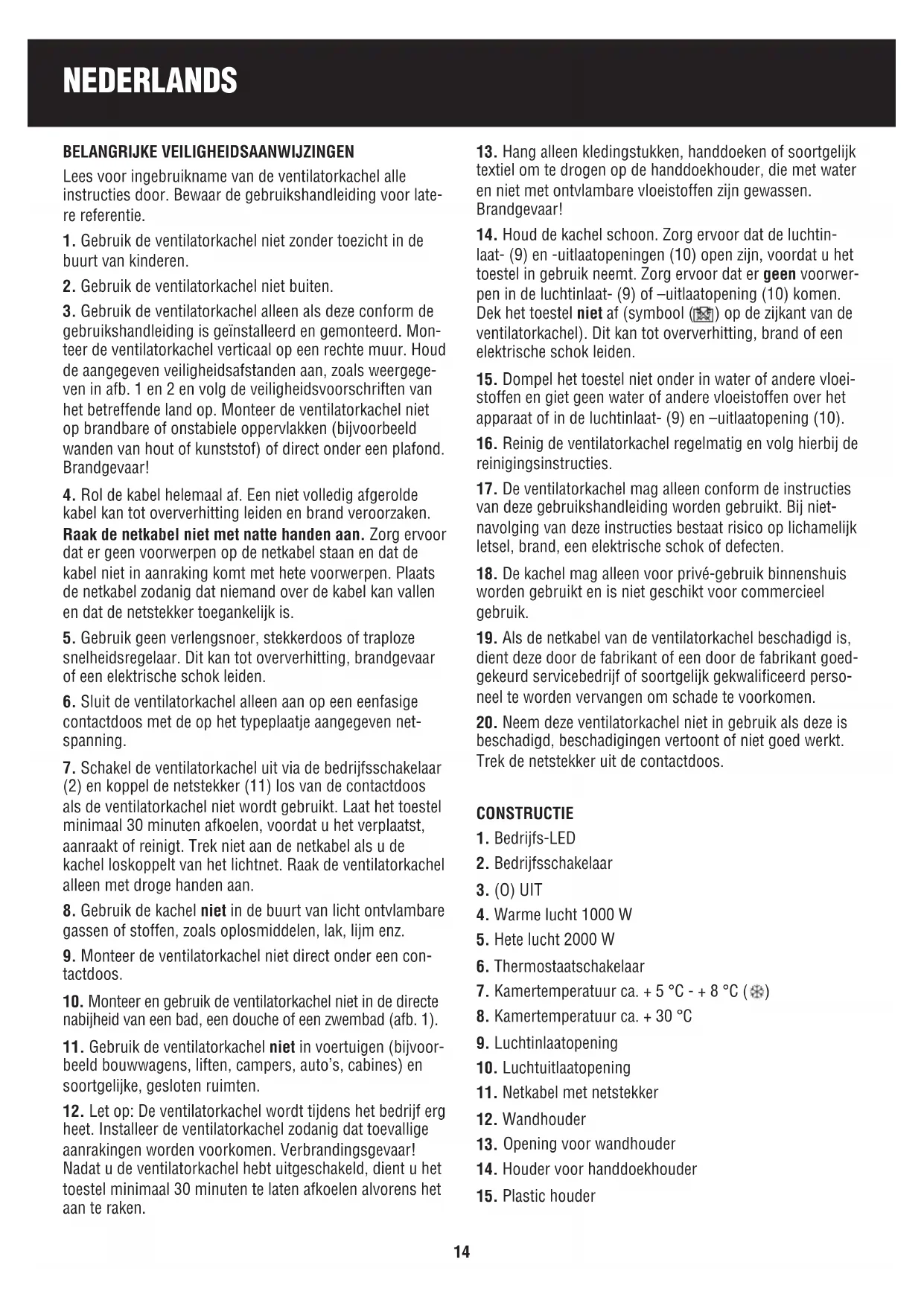 BELANGRIJKE VEILIGHEIDSAANWIJZINGEN Lees voor ingebruikname van de ventilatorkachel alle