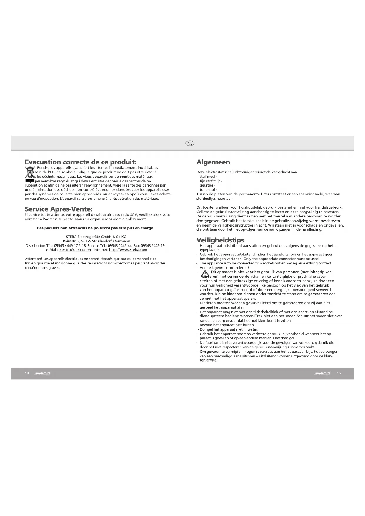 Evacuation correcte de ce produit: Rendre les appareils ayant fait leur temps immédiatement inutilisables Au sein de l’EU, ce symbole indique que ce produit ne doit pas être évacué avec les déchets mécaniques. Les vieux appareils contiennent des matériaux qui peuvent être recyclés et qui devraient être déposés à des centres de ré- cupération et afin de ne pas altérer l’environnement, voire la santé des personnes par une élimintation des déchets non-contrôlée. Veuillez donc évacuer les appareils usés par des systèmes de collecte bien appropriés ou envoyez-lea opoù vous l’avez acheté en vue d’évacuation. L’appareil sera alors amené à la récupération des matériaux. Service Après-Vente: Si contre toute attente, votre appareil devait avoir besoin du SAV, veuillez alors vous adresser à l’adresse suivante. Nous en organiserons alors d’enlèvement. Des paquets non affranchis ne pourront pas être pris en charge. STEBA Elektrogeräte GmbH & Co KG Pointstr. 2, 96129 Strullendorf / Germany Distribution-Tél.: 09543 / 449-17 / -18, Service-Tél.: 09543 / 449-44, Fax: 09543 / 449-19 e-Mail: elektro@steba.com Internet: http://www.steba.com Attention! Les appareils électriques ne seront réparés que par du personnel élec- tricien qualifié étant donné que des réparations non-conformes peuvent avoir des conséquences graves. Algemeen Deze elektrostatische luchtreiniger reinigt de kamerlucht van stuifmeel ∙ fijn stof/mijt ∙ geurtjes ∙ tonerstof ∙ Tussen de platen van de permanente filters ontstaat er een spanningsveld, waaraan stofdeeltjes neerslaan Dit toestel is alleen voor huishoudelijk gebruik bestemd en niet voor handelsgebruik. Gelieve de gebruiksaanwijzing aandachtig te lezen en deze zorgvuldig te bewaren. De gebruiksaanwijzing dient samen met het toestel aan andere personen te worden doorgegeven. Gebruik het toestel zoals in de gebruiksaanwijzing wordt beschreven en neem de veiligheidsinstructies in acht. Wij staan niet in voor schade en ongevallen, die ontstaan door het niet opvolgen van de aanwijzingen in de handleiding. Veiligheidstips Het apparaat uitsluitend aansluiten en gebruiken volgens de gegevens op het ∙ typeplaatje. Gebruik het apparaat uitsluitend indien het aansluitsnoer en het apparaat geen ∙ beschadigingen vertonen. Only the appropriate connector must be used. The appliance is to be connected to a socket-outlet having an earthing contact ∙ Voor elk gebruik controleren! ∙ ∙ Dit apparaat is niet voor het gebruik van personen (met inbegrip van kinderen) met verminderde lichamelijke, zintuiglijke of psychische capa- citeiten of met een gebrekkige ervaring of kennis voorzien, tenzij ze door een voor hun veiligheid verantwoordelijke persoon op het vlak van het gebruik van het apparaat geïnstrueerd of door een dergelijke persoon geobserveerd worden. Kleine kinderen dienen onder toezicht te staan om te garanderen dat ze niet met het apparaat spelen. Kinderen moeten worden gesurveilleerd om te garanderen dat zij van niet ∙ gespeel het apparaat zijn. Het apparaat mag niet met een tijdschakelklok of met een apart, op afstand be- ∙ diend systeem bediend worden!Trek niet aan het snoer. Schuur het snoer niet over randen en zorg ervoor dat het niet klem komt te zitten. Bewaar het apparaat niet buiten. ∙ Dompel het apparaat niet in water. ∙ Gebruik het apparaat nooit na verkeerd gebruik, bijvoorbeeld wanneer het ap- ∙ paraat is gevallen of op een andere manier is beschadigd. De fabrikant is niet verantwoordelijk voor de gevolgen van verkeerd gebruik die ∙ door het niet respecteren van de gebruiksaanwijzing zijn veroorzaakt. Om gevaren te vermijden mogen reparaties aan het apparaat – bijv. het vervangen ∙ van een beschadigd aansluitsnoer – uitsluitend worden uitgevoerd door de klan- tenservice.16