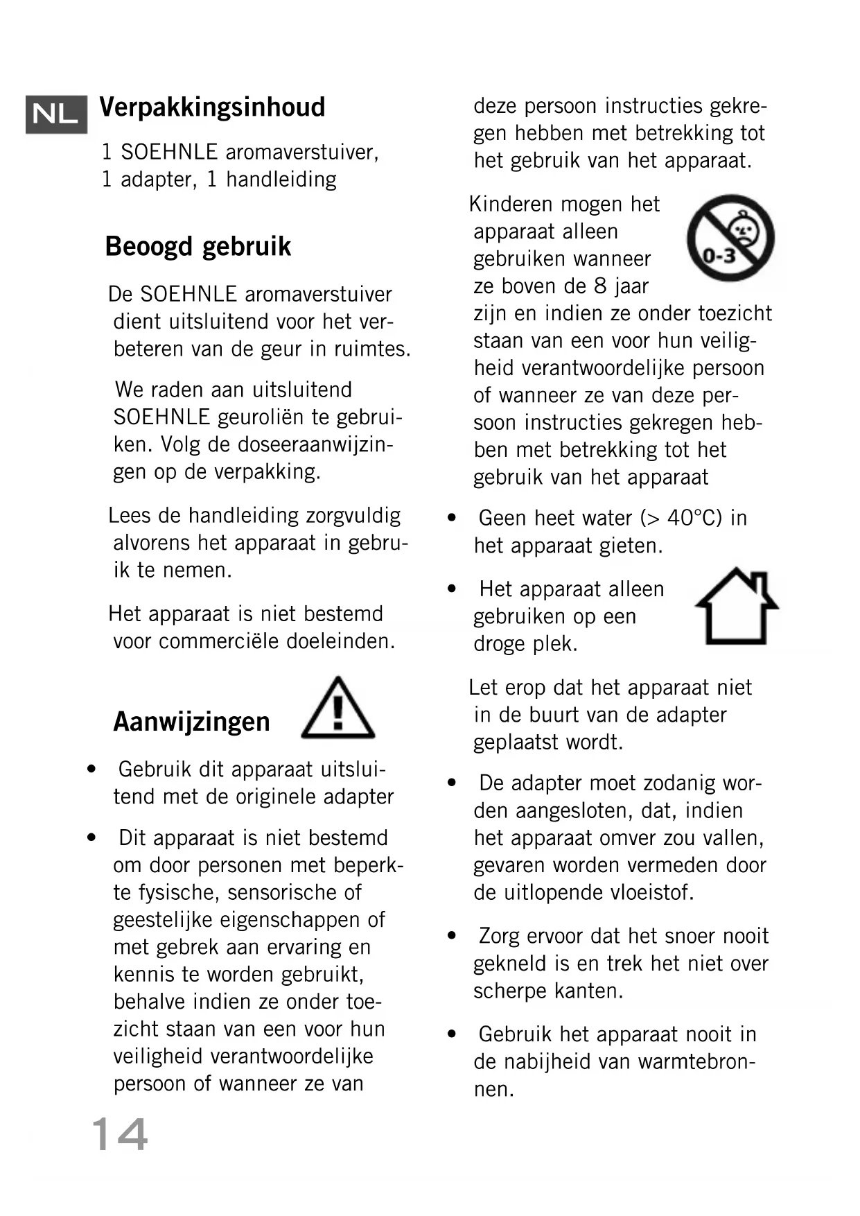 Verpakkingsinhoud 1 SOEHNLE aromaverstuiver, 1 adapter, 1 handleiding Beoogd gebruik De SOEHNLE aromaverstuiver dient uitsluitend voor het ver- beteren van de geur in ruimtes. We raden aan uitsluitend SOEHNLE geuroliën te gebrui- ken. Volg de doseeraanwijzin- gen op de verpakking. Lees de handleiding zorgvuldig alvorens het apparaat in gebru- ik te nemen. Het apparaat is niet bestemd voor commerciële doeleinden. Aanwijzingen