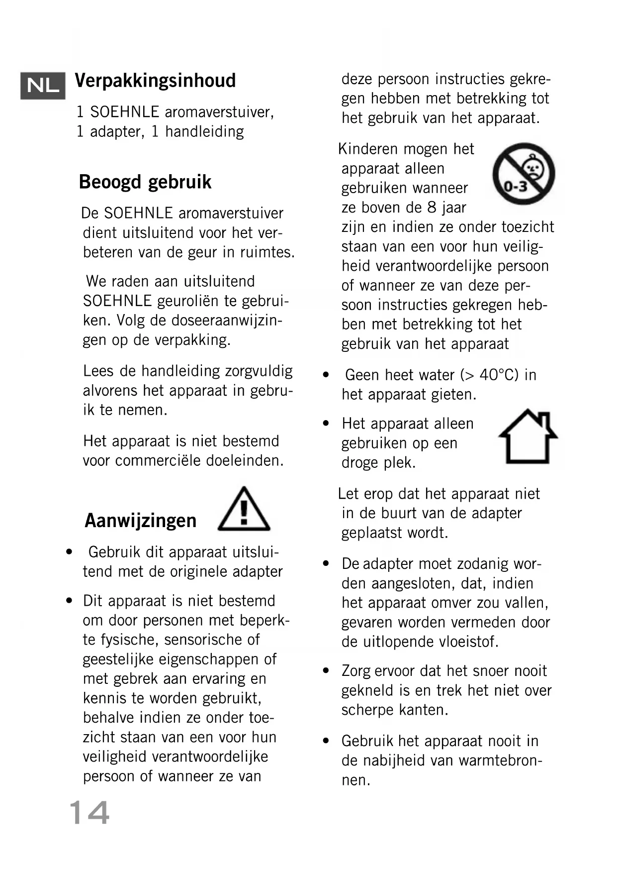 Verpakkingsinhoud 1 SOEHNLE aromaverstuiver, 1 adapter, 1 handleiding Beoogd gebruik De SOEHNLE aromaverstuiver dient uitsluitend voor het ver- beteren van de geur in ruimtes. We raden aan uitsluitend SOEHNLE geuroliën te gebrui- ken. Volg de doseeraanwijzin- gen op de verpakking.