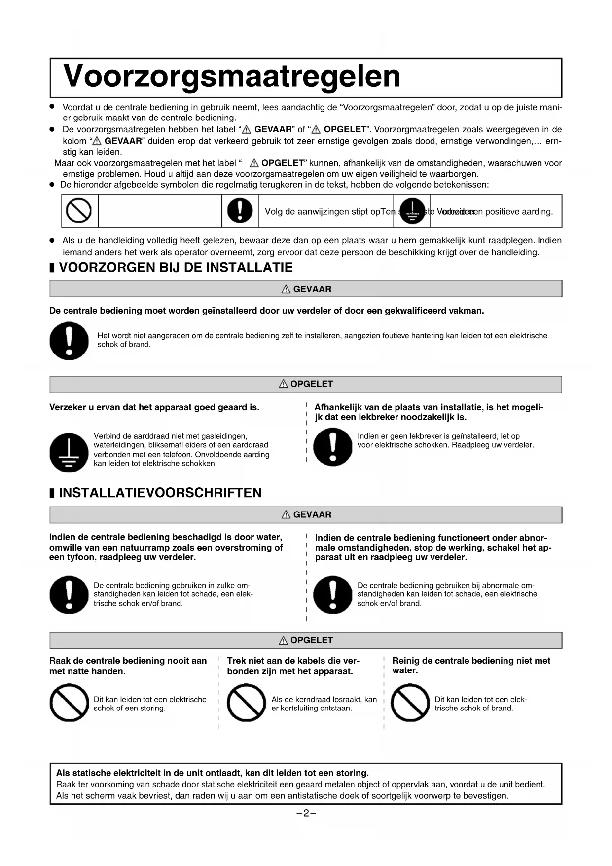 VOORZORGEN BIJ DE INSTALLATIE GEVAAR De centrale bediening moet worden geïnstalleerd door uw verdeler of door een gekwalifi ceerd vakman.