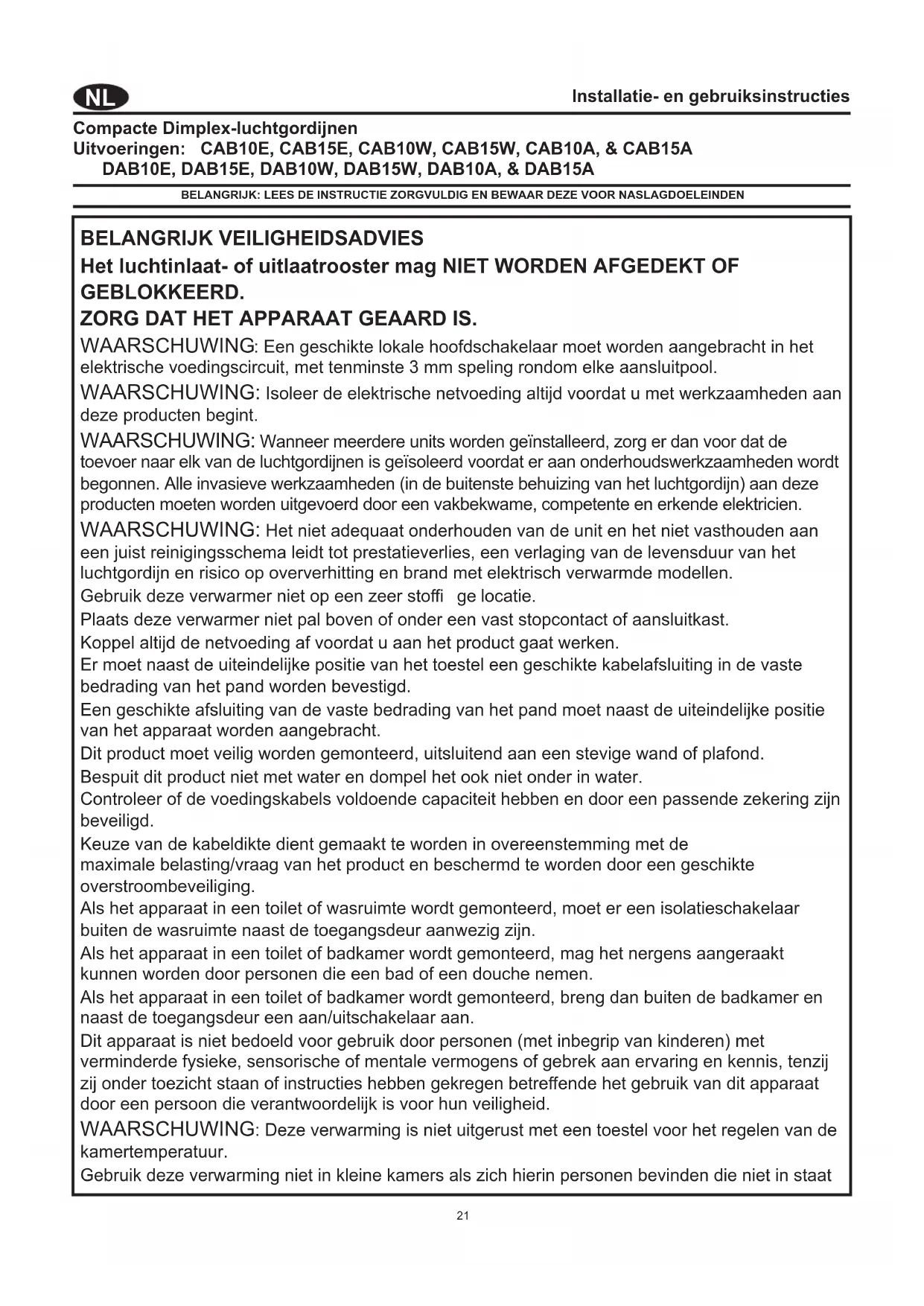 Installatie- en gebruiksinstructies Compacte Dimplex-luchtgordijnen Uitvoeringen: CAB10E, CAB15E, CAB10W, CAB15W, CAB10A, & CAB15A DAB10E, DAB15E, DAB10W, DAB15W, DAB10A, & DAB15A BELANGRIJK: LEES DE INSTRUCTIE ZORGVULDIG EN BEWAAR DEZE VOOR NASLAGDOELEINDEN BELANGRIJK VEILIGHEIDSADVIES Het luchtinlaat- of uitlaatrooster mag NIET WORDEN AFGEDEKT OF GEBLOKKEERD. ZORG DAT HET APPARAAT GEAARD IS. WAARSCHUWING : Een geschikte lokale hoofdschakelaar moet worden aangebracht in het elektrische voedingscircuit, met tenminste 3 mm speling rondom elke aansluitpool. WAARSCHUWING: Isoleer de elektrische netvoeding altijd voordat u met werkzaamheden aan deze producten begint. WAARSCHUWING: Wanneer meerdere units worden geïnstalleerd, zorg er dan voor dat de toevoer naar elk van de luchtgordijnen is geïsoleerd voordat er aan onderhoudswerkzaamheden wordt begonnen. Alle invasieve werkzaamheden (in de buitenste behuizing van het luchtgordijn) aan deze producten moeten worden uitgevoerd door een vakbekwame, competente en erkende elektricien. WAARSCHUWING: Het niet adequaat onderhouden van de unit en het niet vasthouden aan een juist reinigingsschema leidt tot prestatieverlies, een verlaging van de levensduur van het luchtgordijn en risico op oververhitting en brand met elektrisch verwarmde modellen. Gebruik deze verwarmer niet op een zeer stoffi ge locatie. Plaats deze verwarmer niet pal boven of onder een vast stopcontact of aansluitkast. Koppel altijd de netvoeding af voordat u aan het product gaat werken. Er moet naast de uiteindelijke positie van het toestel een geschikte kabelafsluiting in de vaste bedrading van het pand worden bevestigd. Een geschikte afsluiting van de vaste bedrading van het pand moet naast de uiteindelijke positie van het apparaat worden aangebracht. Dit product moet veilig worden gemonteerd, uitsluitend aan een stevige wand of plafond. Bespuit dit product niet met water en dompel het ook niet onder in water. Controleer of de voedingskabels voldoende capaciteit hebben en door een passende zekering zijn beveiligd. Keuze van de kabeldikte dient gemaakt te worden in overeenstemming met de maximale belasting/vraag van het product en beschermd te worden door een geschikte overstroombeveiliging. Als het apparaat in een toilet of wasruimte wordt gemonteerd, moet er een isolatieschakelaar buiten de wasruimte naast de toegangsdeur aanwezig zijn. Als het apparaat in een toilet of badkamer wordt gemonteerd, mag het nergens aangeraakt kunnen worden door personen die een bad of een douche nemen. Als het apparaat in een toilet of badkamer wordt gemonteerd, breng dan buiten de badkamer en naast de toegangsdeur een aan/uitschakelaar aan. Dit apparaat is niet bedoeld voor gebruik door personen (met inbegrip van kinderen) met verminderde fysieke, sensorische of mentale vermogens of gebrek aan ervaring en kennis, tenzij zij onder toezicht staan of instructies hebben gekregen betreff ende het gebruik van dit apparaat door een persoon die verantwoordelijk is voor hun veiligheid. WAARSCHUWING: Deze verwarming is niet uitgerust met een toestel voor het regelen van de kamertemperatuur. Gebruik deze verwarming niet in kleine kamers als zich hierin personen bevinden die niet in staat22 zijn om de kamer te verlaten, tenzij er constant toezicht is. Dit toestel kan worden gebruikt door kinderen vanaf 8 jaar en ouder en door personen met een lichamelijke, zintuiglijke of mentale beperking of gebrek aan kennis en ervaring, maar alleen als zij worden begeleid of instructies krijgen over het op een veilige manier gebruiken van het apparaat. Laat kinderen nooit met het apparaat spelen. Reinigen en onderhoudswerkzaamheden mogen niet door kinderen zonder toezicht worden uitgevoerd. Kinderen jonger dan 3 jaar mogen niet bij het toestel komen, tenzij zij voortdurend worden begeleid. Kinderen vanaf 3 jaar maar jonger dan 8 jaar mogen het apparaat alleen aan/uit zetten op voorwaarde dat deze in de normale functioneringspositie is geplaatst of geïnstalleerd en ze begeleiding of instructie hebben gekregen ten aanzien van het veilige gebruik van het apparaat en de betreff ende gevaren begrijpen. Kinderen ouder dan 3 en jonger dan 8 jaar mogen de stekker van het apparaat niet in het stopcontact steken, het apparaat niet instellen, niet reinigen en geen onderhoudswerkzaamheden uitvoeren. WAARSCHUWING - Sommige onderdelen van dit product kunnen heel heet worden en brandwonden veroorzaken. Bijzondere waakzaamheid is geboden wanneer er kinderen en kwetsbare personen aanwezig zijn. WAARSCHUWING: Schakel bij het uitvoeren van onderhoudswerkzaamheden de elektriciteitstoevoer naar ALLE modulair geschakelde eenheden uit. INSPECTIE De frequentie van de schoonmaakcyclus hangt af van de omgeving waarin het gordijn is geïnstalleerd. Minimaal raadt Dimplex een wekelijkse controle aan, om er zo voor te zorgen dat er zich geen grote opeenhoping van stof of vuil voordoet die de prestaties van het luchtgordijn vermindert en geuroverlast kan veroorzaken. Verwijder tijdens inspectie eventuele vreemde voorwerpen die worden aangetroff en. Deze kunnen schade veroorzaken aan de ventilator, waaiers of elementen. Het uiterlijk van het luchtgordijn kan worden gehandhaafd door het luchtgordijn af en toe af te vegen met een vochtige doek. Gebruik een lichte zeepoplossing voor het verwijderen van vlekken. Deze kan worden aangebracht met een doek. Veeg het oppervlak vervolgens droog. Er dienen voorzorgsmaatregelen te worden genomen om te voorkomen dat in het product binnendringt.