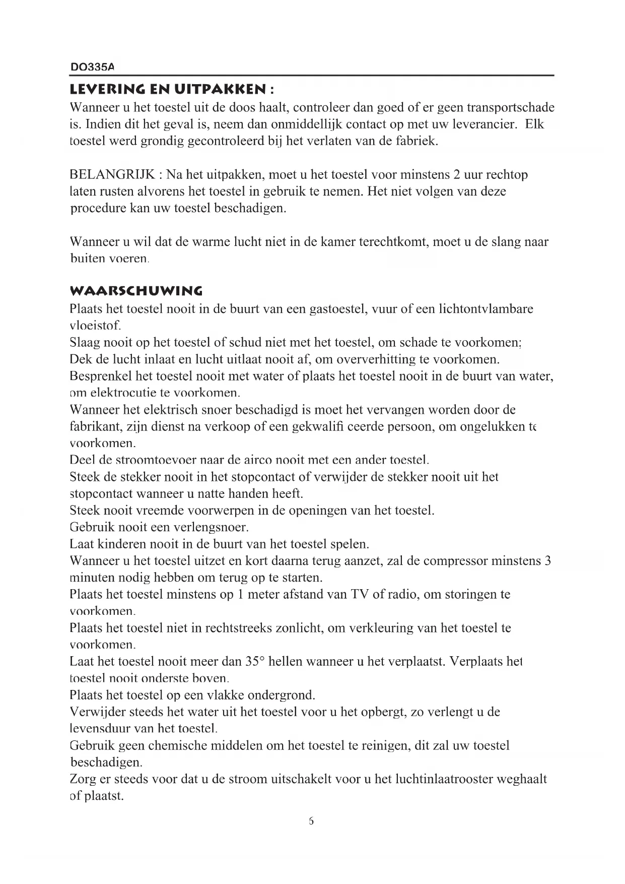 HANDLEIDING MODE D’EMPLOI GEBRAUCHSANLEITUNG INSTRUCTION BOOKLET PRODUCT OF AIRCONDITIONER CLIMATISEUR KLIMAANLAGE AIR CONDITIONER DO335ADO335A GARANTIEVOORWAARDEN Dit apparaat heeft een garantietermijn van 2 jaar vanaf de datum van aankoop.