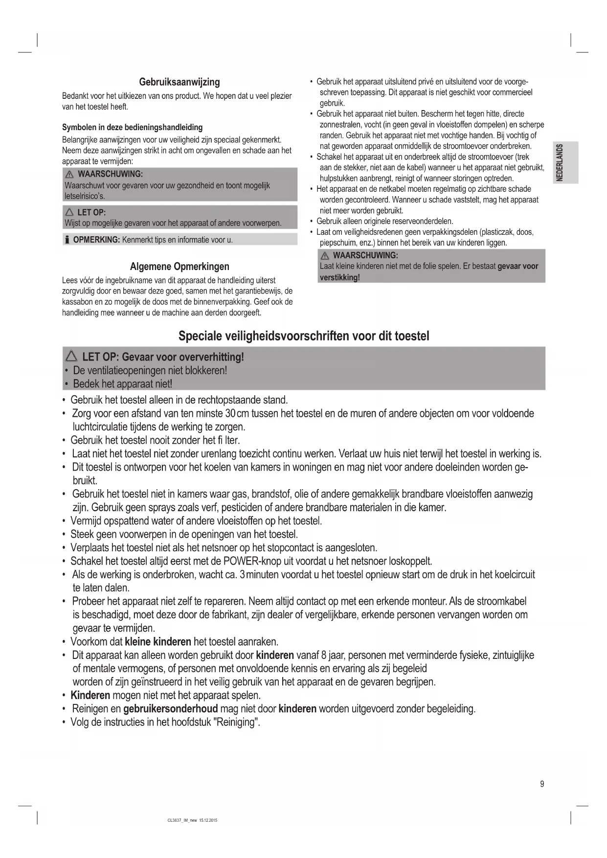 • Laat niet het toestel niet zonder urenlang toezicht continu werken. Verlaat uw huis niet terwijl het toestel in werking is.