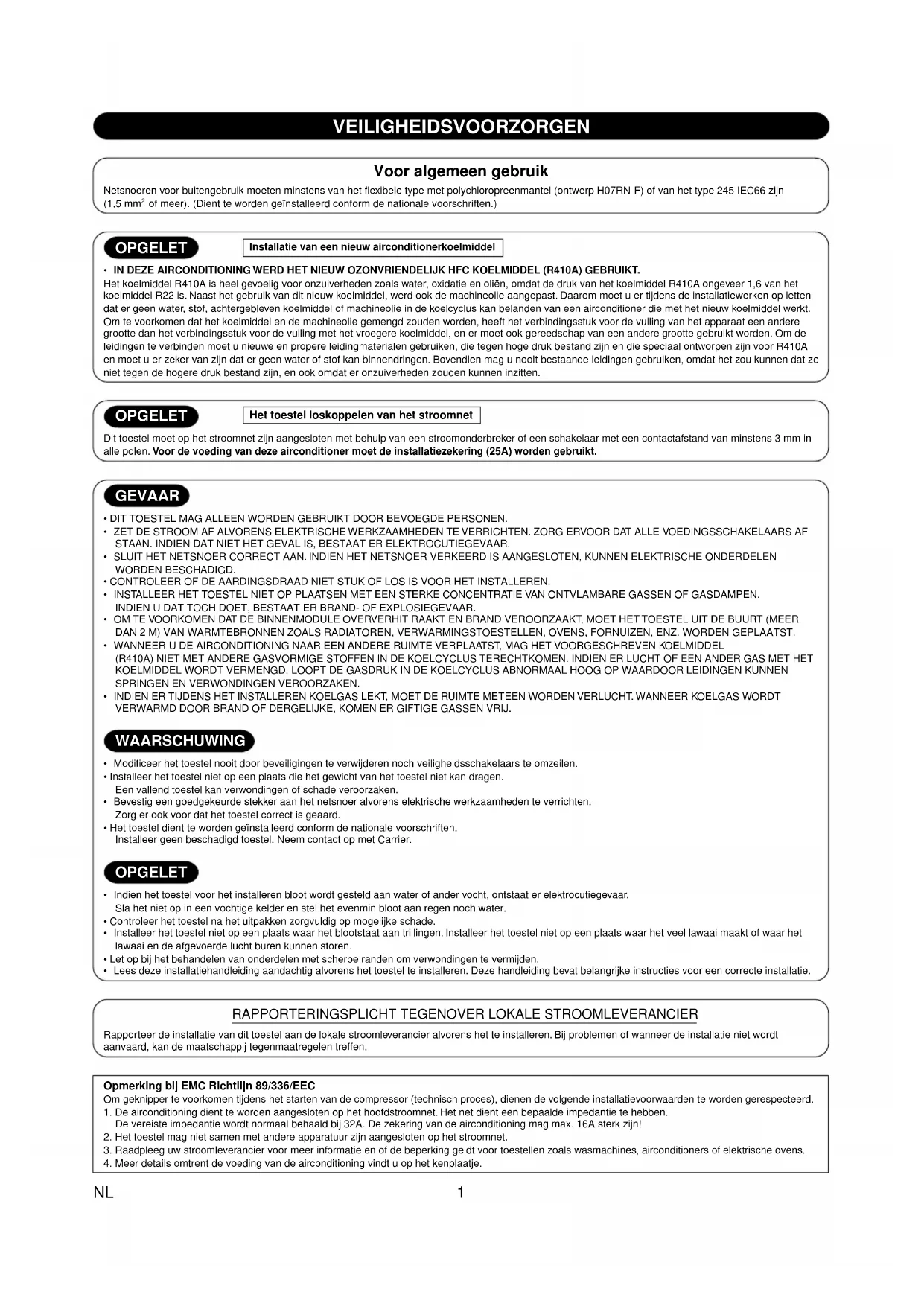 Rapporteer de installatie van dit toestel aan de lokale stroomleverancier alvorens het te installeren. Bij problemen of wanneer de installatie niet wordt aanvaard, kan de maatschappij tegenmaatregelen treffen. Opmerking bij EMC Richtlijn 89/336/EEC Om geknipper te voorkomen tijdens het starten van de compressor (technisch proces), dienen de volgende installatievoorwaarden te worden gerespecteerd. 1. De airconditioning dient te worden aangesloten op het hoofdstroomnet. Het net dient een bepaalde impedantie te hebben. De vereiste impedantie wordt normaal behaald bij 32A. De zekering van de airconditioning mag max. 16A sterk zijn!2. Het toestel mag niet samen met andere apparatuur zijn aangesloten op het stroomnet. 3. Raadpleeg uw stroomleverancier voor meer informatie en of de beperking geldt voor toestellen zoals wasmachines, airconditioners of elektrische ovens.