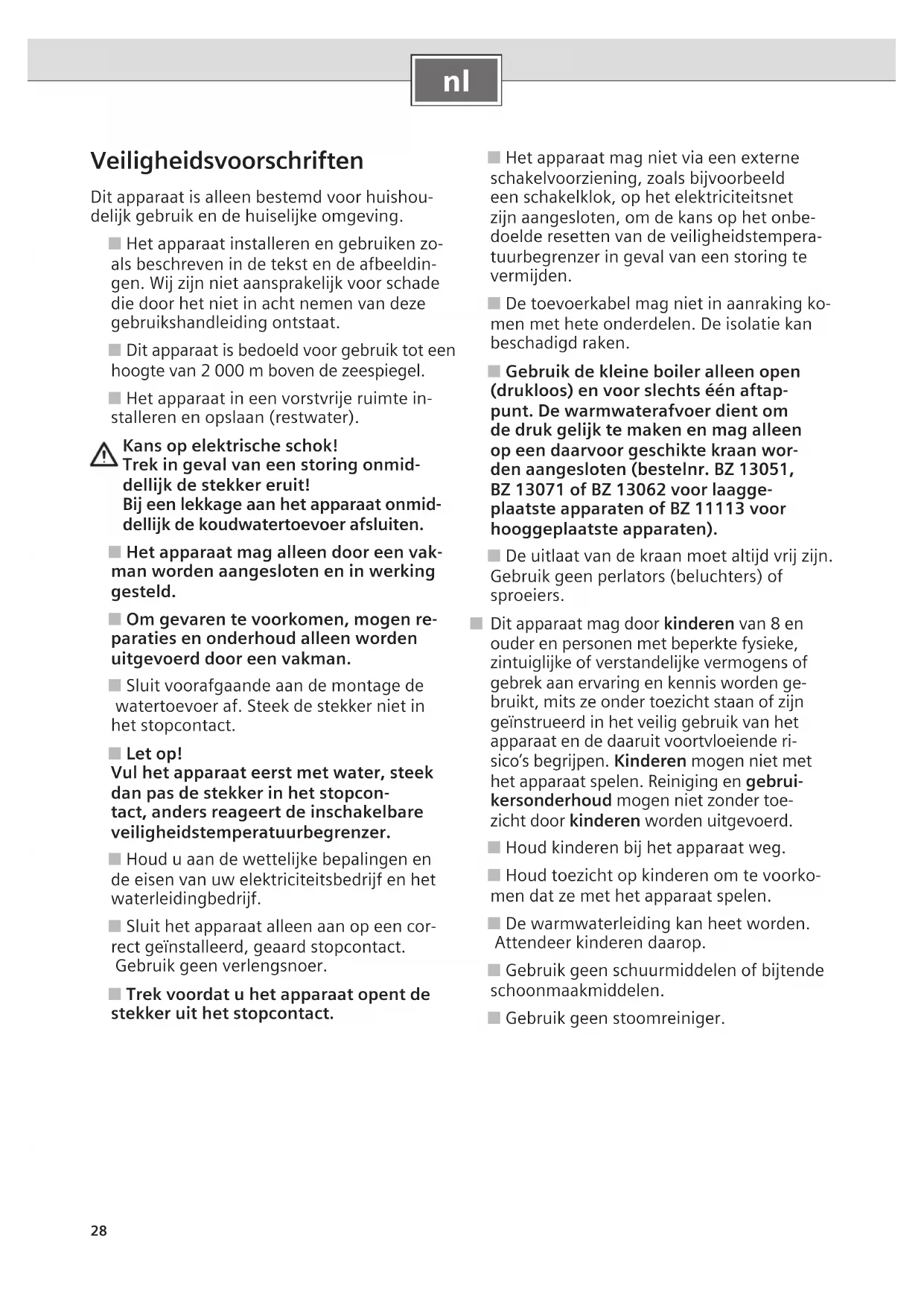 Gebruikshandleiding ■ Lees voordat u het apparaat gaat gebruiken, deze in-structies zorgvuldig door en neem ze in acht! ■ Belangrijk: stel het apparaat nooit aan vorst bloot! Kans op elektrische schok!Trek in geval van een storing onmiddellijk de stek-ker eruit!Sluit bij een lek aan het apparaat onmiddellijk de koudwatertoevoer af.Lees a.u.b. de uitvoerige veiligheidsinstructies aan het begin van deze handleiding en volg ze op!