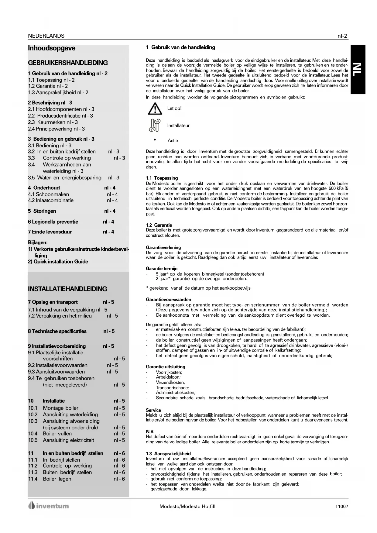 Inventum of uw installateur/leverancier accepteert geen aansprakelijkheid voor schade of lichamelijk letsel van welke aard dan ook ontstaan door:- het niet opvolgen van de instructies in deze handleiding;- onvoorzichtigheid tijdens het installeren, gebruiken, onderhouden en repareren van deze boiler;- gebruik niet conform de toepassing;- het toepassen van onderdelen welke niet door de fabrikant zijn geleverd;- gevolgschade door lekkage.