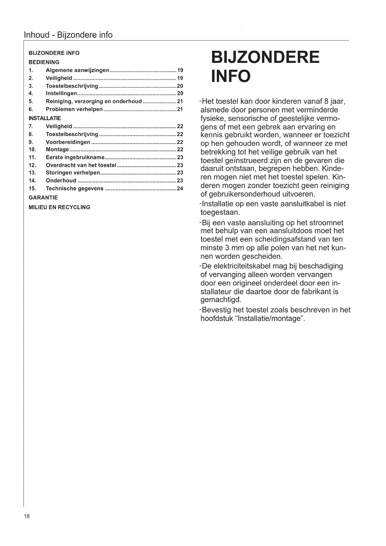1. Algemene aanwijzingen De hoofdstukken “Bediening” en “Bijzondere info” zijn bedoeld voor de gebruiker van het toestel en voor de installateur.Het hoofdstuk "Installatie" is bestemd voor de installateur.