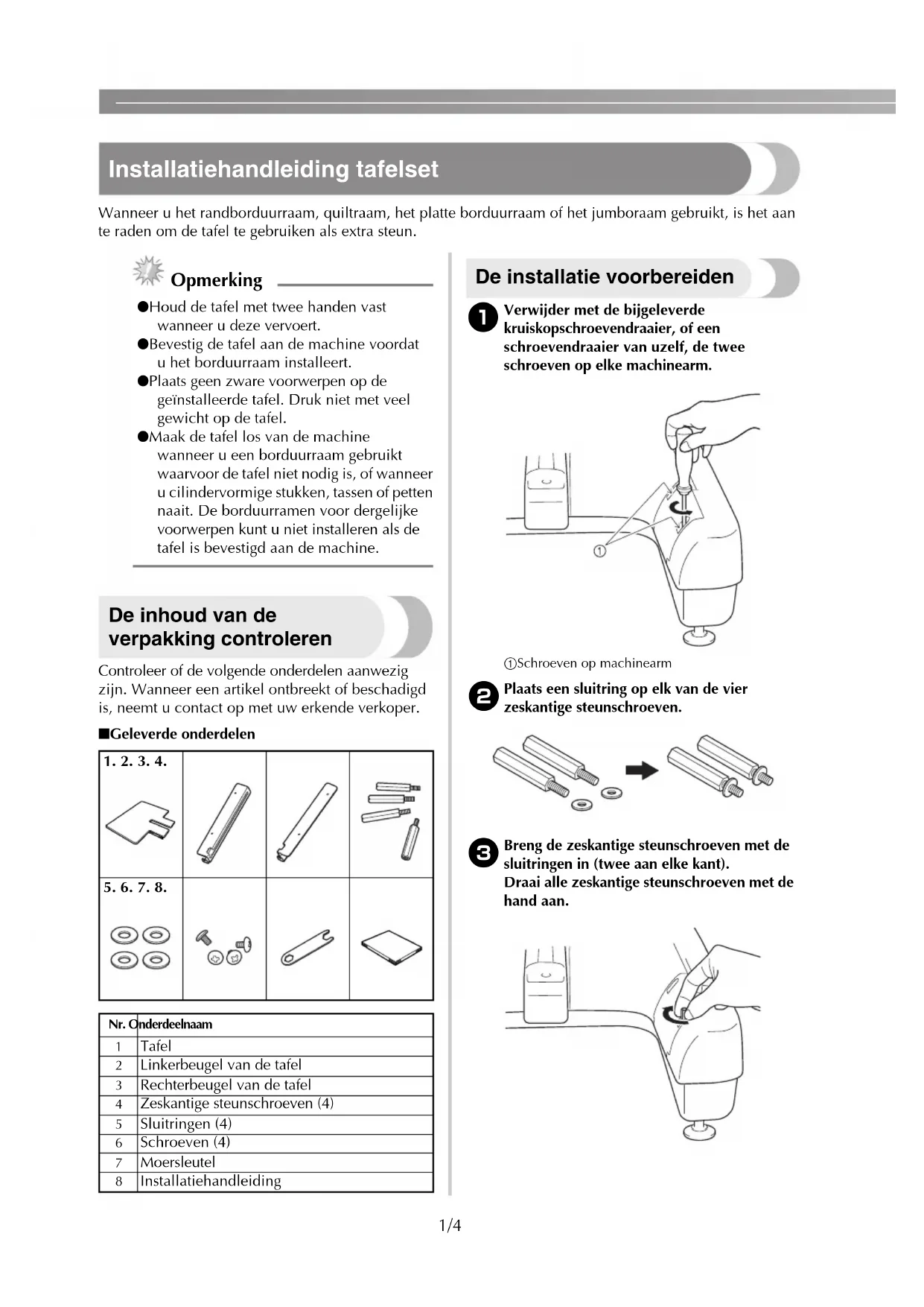 schroeven op elke machinearm. 1 Schroeven op machinearm 2