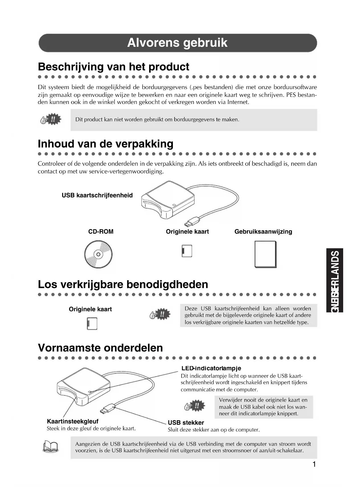 Vornaamste onderdelen Dit product kan niet worden gebruikt om borduurgegevens te maken. Deze USB kaartschrijfeenheid kan alleen wordengebruikt met de bijgeleverde originele kaart of anderelos verkrijgbare originele kaarten van hetzelfde type. Aangezien de USB kaartschrijfeenheid via de USB verbinding met de computer van stroom wordtvoorzien, is de USB kaartschrijfeenheid niet uitgerust met een stroomsnoer of aan/uit-schakelaar. Alvorens gebruik CD-ROMOriginele kaartGebruiksaanwijzingUSB kaartschrijfeenheidOriginele kaartUSB stekkerSluit deze stekker aan op de computer.