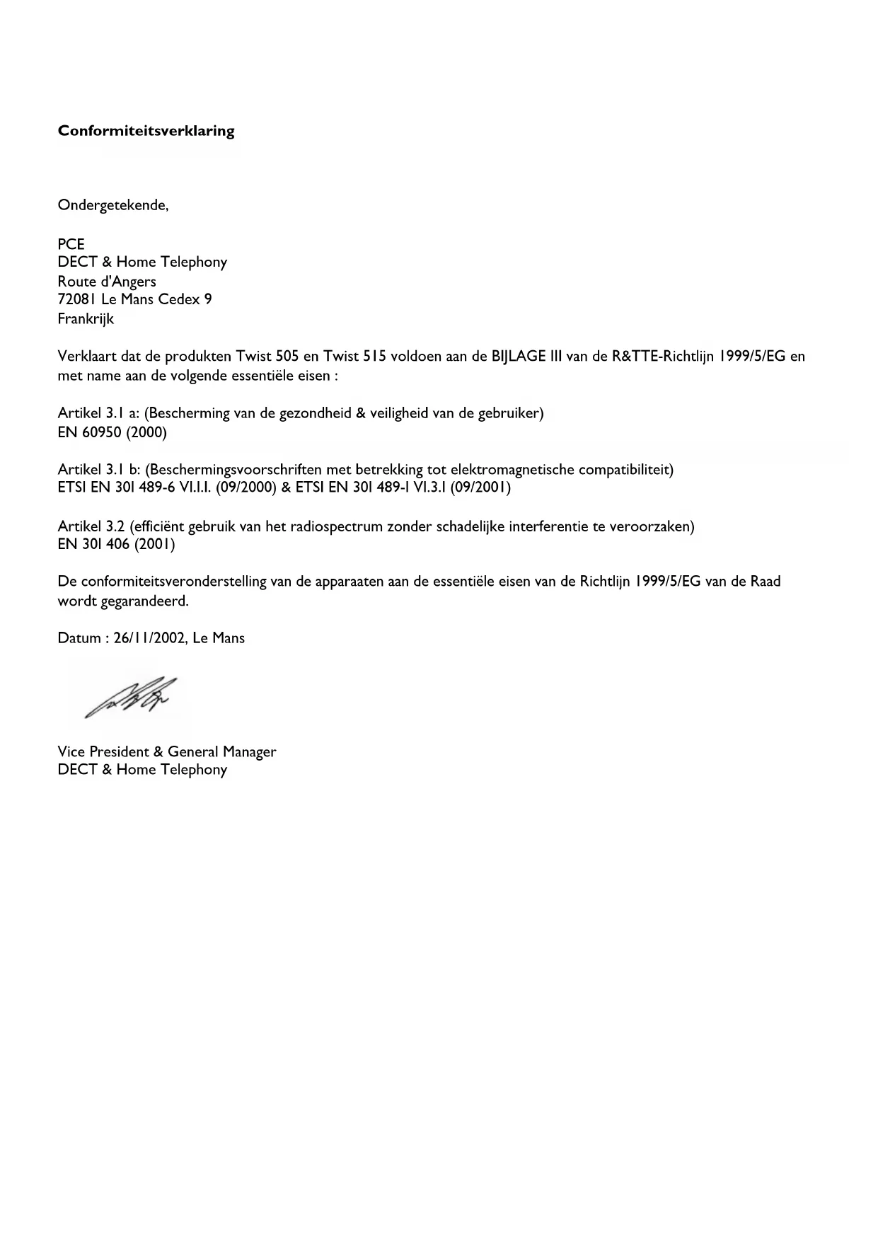 Cover_505.515_A5 15/01/03 16:19 Page 2Conformiteitsverklaring Ondergetekende, PCE DECT & Home Telephony Route d'Angers 72081 Le Mans Cedex 9 Frankrijk Verklaart dat de produkten Twist 505 en Twist 515 voldoen aan de BIJLAGE III van de R&TTE-Richtlijn 1999/5/EG en met name aan de volgende essentiële eisen : Artikel 3.1 a: (Bescherming van de gezondheid & veiligheid van de gebruiker) EN 60950 (2000) Artikel 3.1 b: (Beschermingsvoorschriften met betrekking tot elektromagnetische compatibiliteit) ETSI EN 30I 489-6 VI.I.I. (09/2000) & ETSI EN 30I 489-I VI.3.I (09/2001) Artikel 3.2 (efficiënt gebruik van het radiospectrum zonder schadelijke interferentie te veroorzaken) EN 30I 406 (2001) De conformiteitsveronderstelling van de apparaaten aan de essentiële eisen van de Richtlijn 1999/5/EG van de Raad wordt gegarandeerd. Datum : 26/11/2002, Le Mans Vice President & General Manager DECT & Home Telephony Onis 300 NL_Belgacom 04.02.03.qxd 28/02/03 12:17 Page 2Handset Twist 505/515