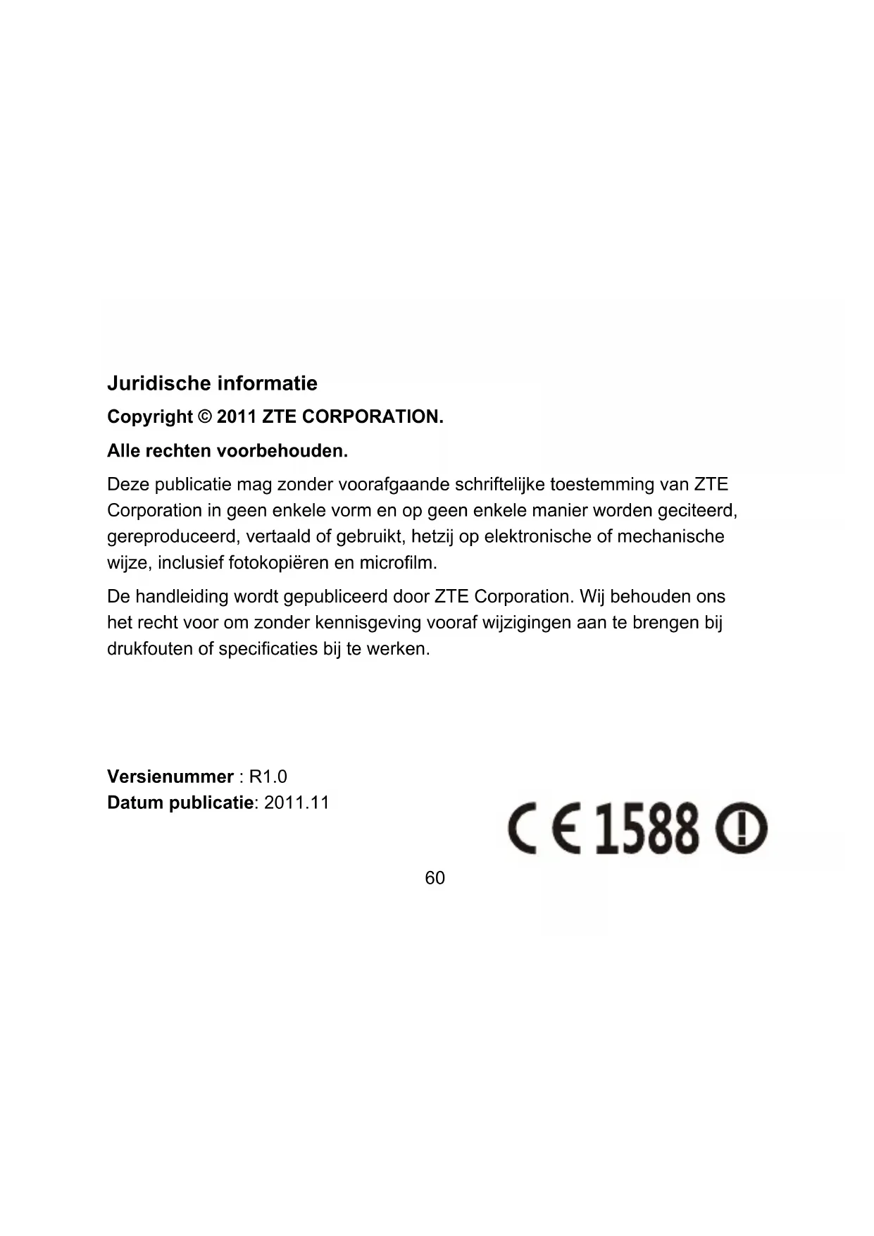 Veiligheidsinformatie over het product Lees het gedeelte Veiligheidsinformatie op deze pagina. Niet gebruiken tijdens het tanken. Gebruik een handsfree-kit tijdens het rijden. Dit toestel kan helder of knipperend licht produceren. De kleine onderdelen kunnen verstikkingsgevaar veroorzaken. Gooi het toestel niet in open vuur. Dit toestel kan een hard geluid produceren. Vermijd contact met magnetische voorwerpen. Houd dit toestel uit de buurt van pacemakers en andere medische apparatuur. Vermijd extreme temperaturen.65 Schakel het toestel uit als dit in ziekenhuizen en andere zorginstellingen wordt aangegeven. Vermijd contact met vloeistoffen, houd het toestel droog. Schakel het toestel uit als dit in een vliegtuig of op een vliegveld wordt aangegeven. Haal het toestel niet uit elkaar. Schakel het toestel uit op plekken met explosiegevaar. Vertrouw niet volledig op dit toestel als u alarmnummers wilt bellen. Gebruik alleen goedgekeurde accessoires.66 V9A Skrócona instrukcja obsługi67 INFORMACJE PRAWNE Copyright © 2011 ZTE CORPORATION. Wszelkie prawa zastrzeżone Zabrania się tworzenia wyciągów, kopii, tłumaczeń i wykorzystywania niniejszego dokumentu w jakikolwiek sposób, zarówno za pomocą środków elektronicznych, jak i mechanicznych, w tym fotokopiowania i zapisywania na mikrofilmie, bez pisemnego zezwolenia rmy ZTE Corporation. Niniejsza instrukcja została opublikowana przez rmę ZTE Corporation. Wydawca zastrzega prawo do modyfikowania niniejszego dokumentu w celu korekty błędów w druku lub aktualizowania danych technicznych bez wcześniejszego powiadomienia. Numer wersji : R1.0 Data wydania: 2011.1168 Informacje ogólne Głośnik Gniazdo słuchawek Tylna osłona Ekran dotykowy Powrót kamery Głośnik Klawisz Menu Klawisz ekranu głównego Klawisz Wstecz Przód aparatu Czujnik światła Lampka Gniazdo ładowarki/USB Klawisz zasilania Klawisze regulacji głośności69 Zanim zaczniesz Więcej informacji można znaleźć w instrukcji obsługi znajdującej się na dołączonej karcie microSD.