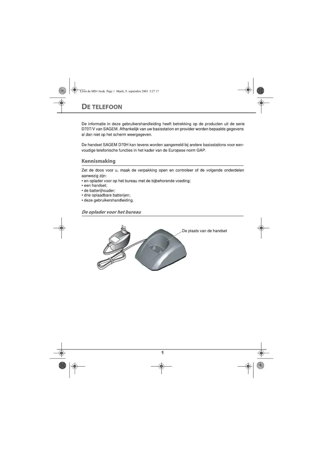 MEMO Livre du MD+.book Page II Mardi, 9. septembre 2003 5:27 171 DE TELEFOON De informatie in deze gebruikershandleiding heeft betrekking op de producten uit de serieD70T/V van SAGEM. Afhankelijk van uw basisstation en provider worden bepaalde gegevensal dan niet op het scherm weergegeven.De handset SAGEM D70H kan tevens worden aangemeld bij andere basisstations voor een-voudige telefonische functies in het kader van de Europese norm GAP. Kennismaking Zet de doos voor u, maak de verpakking open en controleer of de volgende onderdelenaanwezig zijn:• en oplader voor op het bureau met de bijbehorende voeding;• een handset;• de batterijhouder;• drie oplaadbare batterijen;• deze gebruikershandleiding. De oplader voor het bureau De plaats van de handsetLivre du MD+.book Page 1 Mardi, 9. septembre 2003 5:27 172 DE TELEFOON De handset De handset is ergonomisch vormgegeven. U zult het onderhoud van de handset en de kwaliteit van de gesprekken bijzonder waarderen. De navigator voor snelle selecties Grafisch scherm Programmeerbare toetsen Toets toegang tot telefoonboek Ophangen Alfanumeriek toetsenblok Hulp voor slechtziende Opnemen Handsfree Nummerherhaling (lang