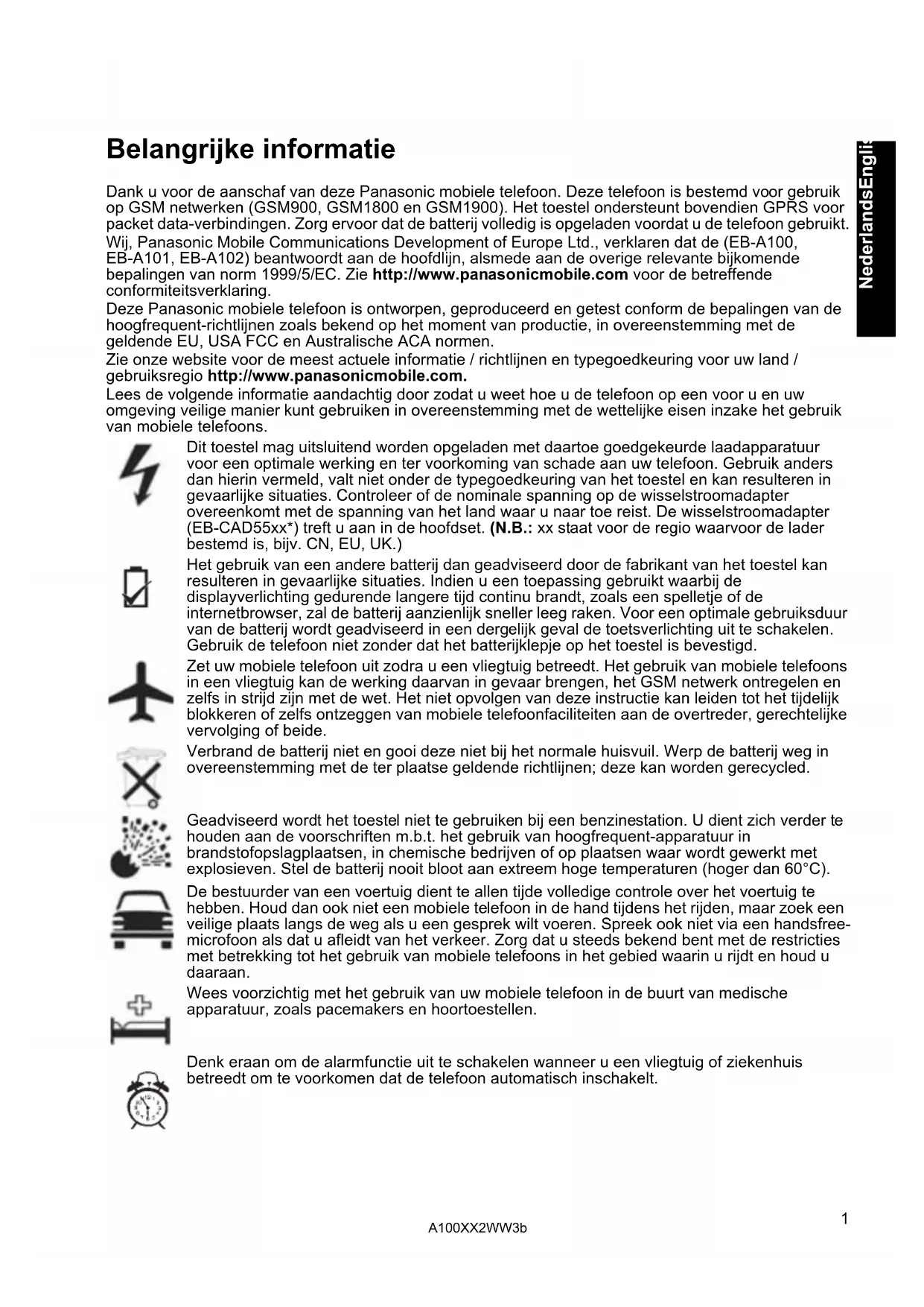 Dank u voor de aanschaft van deze Panasonic mobiele telefoon. Deze telefoon is bestemd voor gebruik op GSM netwerken (GSM900, GSM1800 en GSM1900). Het toestel ondersteunt bovendien GPRS voor packet data-verbindingen. Zorg ervoor dat de batterij volledig is opgeladen voordat u de telefon gezruikt. Wij, Panasonic Mobile Communications Development of Europe Ltd., verklaren dat de (EB-A100, EB-A101, EB-A102) beantwoordert aan de hoofdlijn, alsmede aan de overige relevante bijkomende bepalingen van norm 1999/5/EC. Zie http://www.panasonicmobile.com voor de betreffende conformiteitsverklaring.