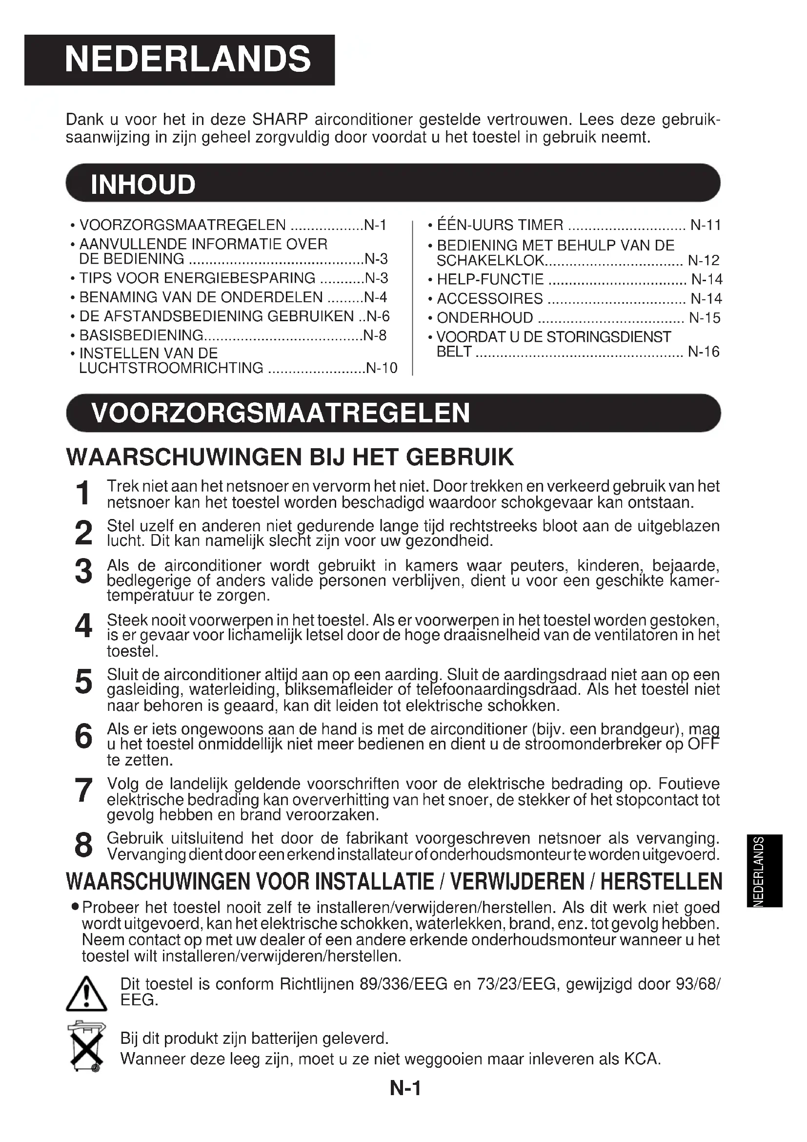 Probeer het toestel nooit zelf te installeren/verwijderen/herstellen. Als dit werk niet goedwordt uitgevoerd, kan het elektrische schokken, waterlekken, brand, enz. tot gevolg hebben.Neem contact op met uw dealer of een andere erkende onderhoudsmonteur wanneer u hettoestel wilt installeren/verwijderen/herstellen.Dit toestel is conform Richtlijnen 89/336/EEG en 73/23/EEG, gewijzigd door 93/68/ EEG. Bij dit produkt zijn batterijen geleverd.Wanneer deze leeg zijn, moet u ze niet weggooien maar inleveren als KCA. VOORZORGSMAATREGELENN-2 VOORZORGSMAATREGELEN