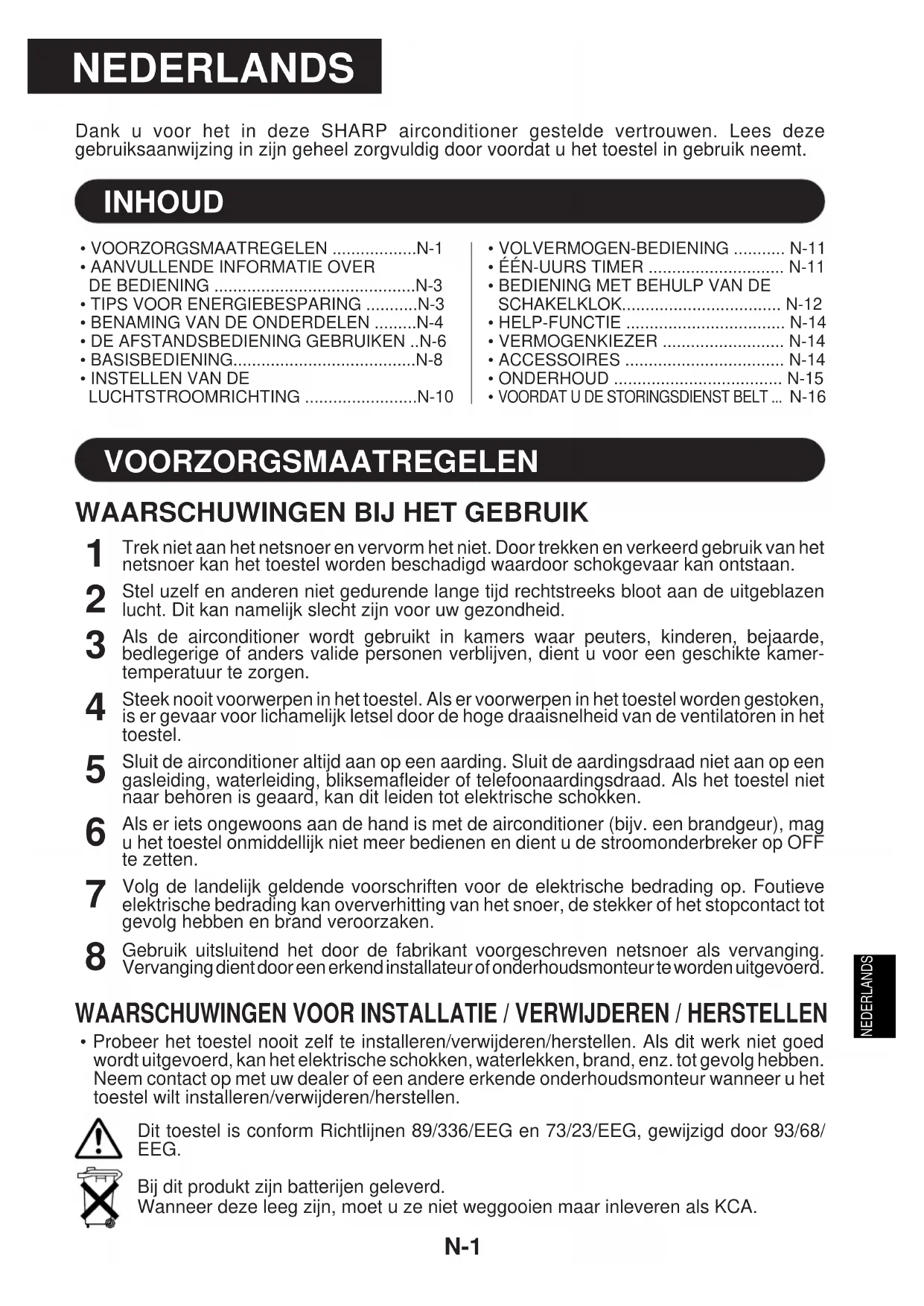 Dank u voor het in deze SHARP airconditioner gestelde vertrouwen. Lees deze gebruiksaanwijzing in zijn geheel zorgvuldig door voordat u het toestel in gebruik neemt.