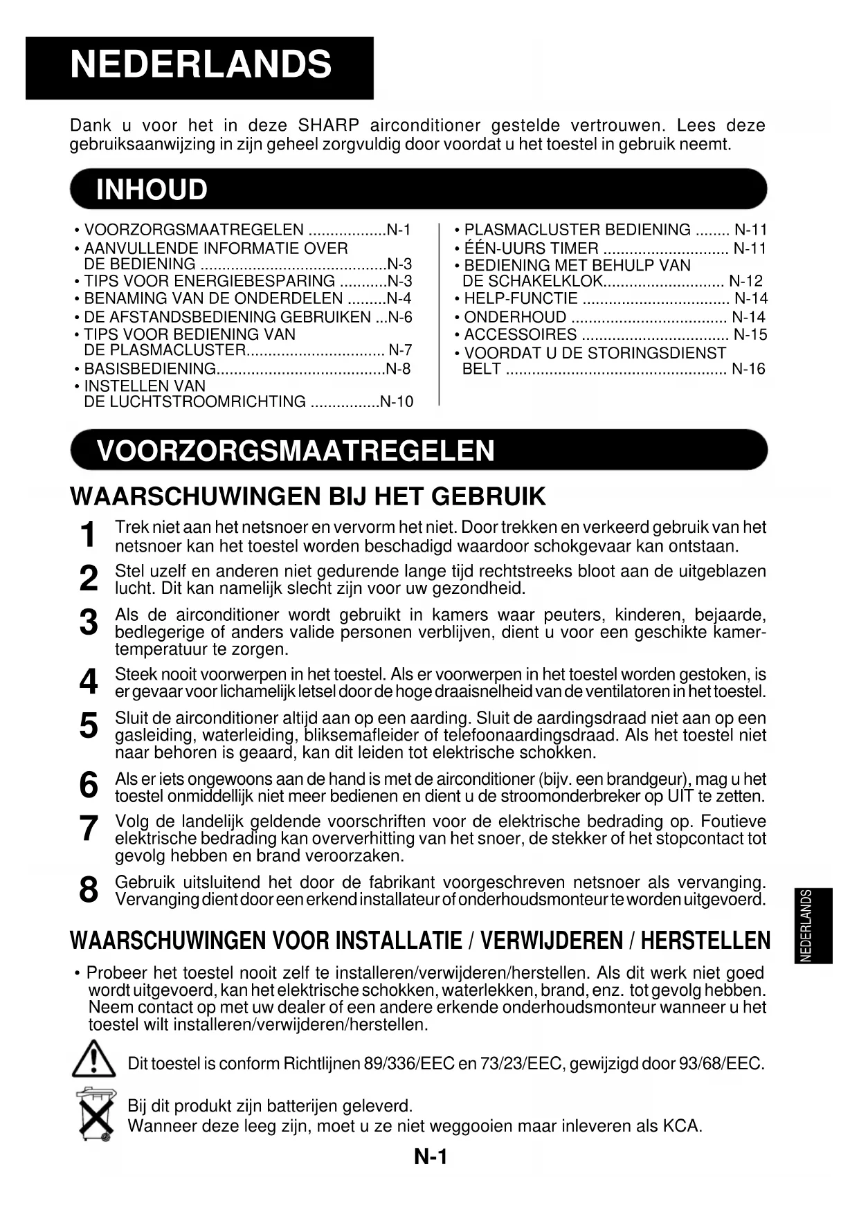 - Probeer het toestel nooit zelf te installeren/verwijderen/herstellen. Als dit werk niet goedwordt uitgevoerd, kan het elektrische schokken, waterlekken, brand, enz. tot gevolg hebben.Neem contact op met uw dealer of een andere erkende onderhoudsmonteur wanneer u hettoestel wilt installeren/verwijderen/herstellen.Dit toestel is conform Richtlijnen 89/336/EEC en 73/23/EEC, gewijzigd door 93/68/EEC. NEDERLANDS Bij dit produkt zijn batterijen geleverd.Wanneer deze leeg zijn, moet u ze niet weggooien maar inleveren als KCA.VOORZORGSMAATREGELEN