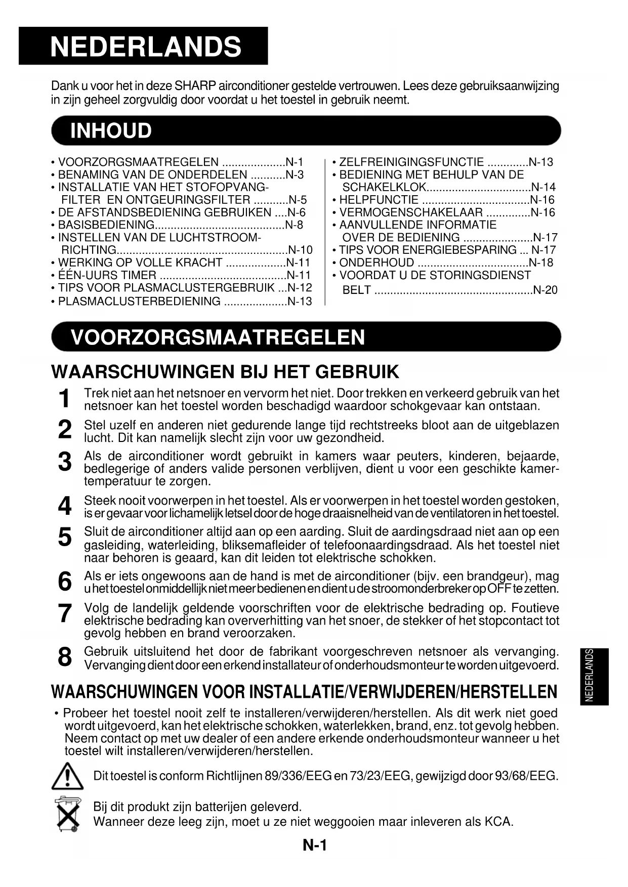- Probeer het toestel nooit zelf te installeren/verwijderen/herstellen. Als dit werk niet goedwordt uitgevoerd, kan het elektrische schokken, waterlekken, brand, enz. tot gevolg hebben.Neem contact op met uw dealer of een andere erkende onderhoudsmonteur wanneer u hettoestel wilt installeren/verwijderen/herstellen.Dit toestel is conform Richtlijnen 89/336/EEG en 73/23/EEG, gewijzigd door 93/68/EEG.Bij dit produkt zijn batterijen geleverd.Wanneer deze leeg zijn, moet u ze niet weggooien maar inleveren als KCA. VOORZORGSMAATREGELENVOORZORGSMAATREGELEN