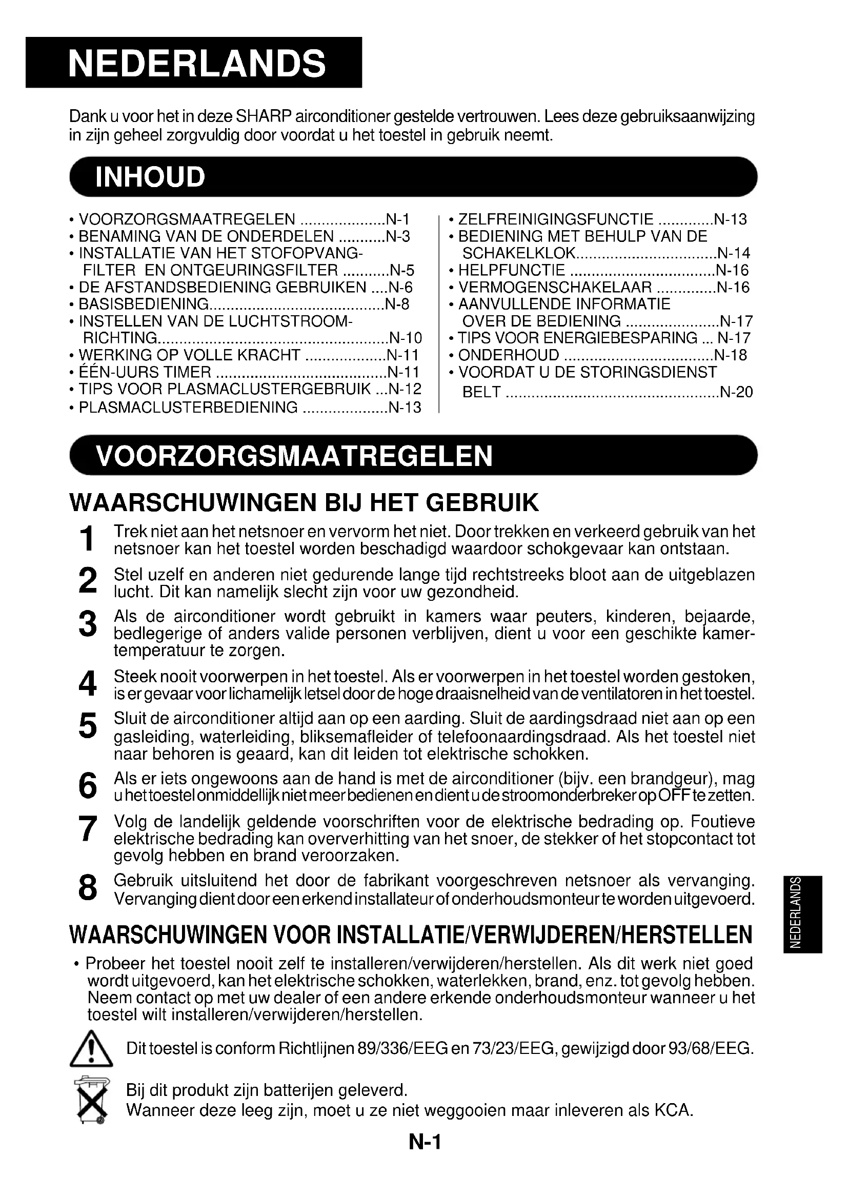- Probeer het toestel nooit zelf te installeren/verwijderen/herstellen. Als dit werk niet goedwordt uitgevoerd, kan het elektrische schokken, waterlekken, brand, enz. tot gevolg hebben.Neem contact op met uw dealer of een andere erkende onderhoudsmonteur wanneer u hettoestel wilt installeren/verwijderen/herstellen.Dit toestel is conform Richtlijnen 89/336/EEG en 73/23/EEG, gewijzigd door 93/68/EEG.Bij dit produkt zijn batterijen geleverd.Wanneer deze leeg zijn, moet u ze niet weggooien maar inleveren als KCA. VOORZORGSMAATREGELENVOORZORGSMAATREGELEN