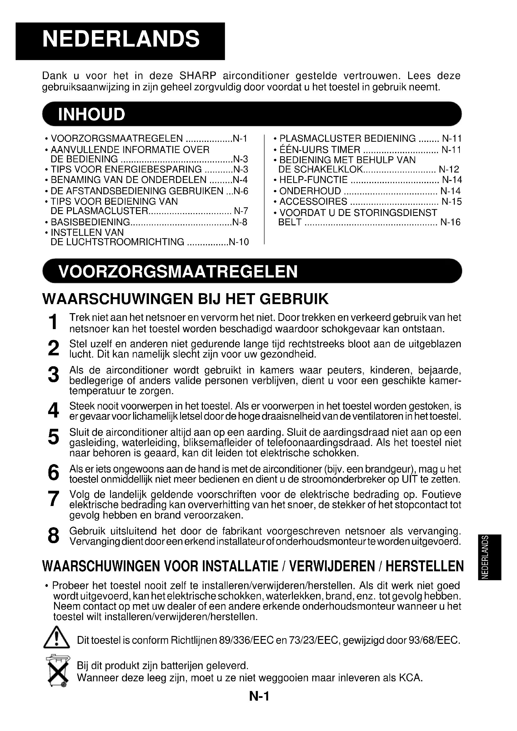 - Probeer het toestel nooit zelf te installeren/verwijderen/herstellen. Als dit werk niet goedwordt uitgevoerd, kan het elektrische schokken, waterlekken, brand, enz. tot gevolg hebben.Neem contact op met uw dealer of een andere erkende onderhoudsmonteur wanneer u hettoestel wilt installeren/verwijderen/herstellen.Dit toestel is conform Richtlijnen 89/336/EEC en 73/23/EEC, gewijzigd door 93/68/EEC. NEDERLANDS Bij dit produkt zijn batterijen geleverd.Wanneer deze leeg zijn, moet u ze niet weggooien maar inleveren als KCA.VOORZORGSMAATREGELEN