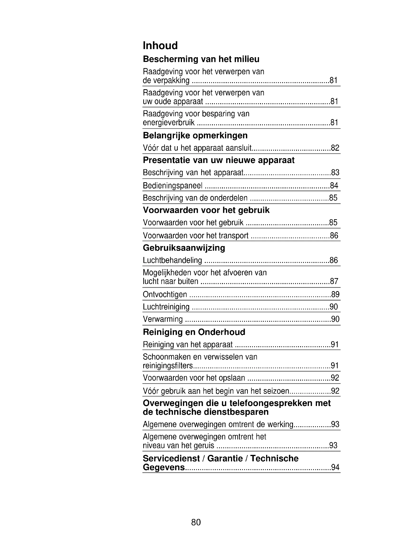 Bescherming van het milieu Raadgeving voor het verwerpen van de verpakking ❏ Ontzie het milieu bij het verwerpen van de verpakking van uw apparaat. ❏ Onze producten worden met zorg ingepakt voor het transport. Alle voor de verpakking gebruikte materialen zijn milieuvriendelijk (het karton wordt gemaakt van gebruikt papier) en kunnen geregenereerd worden. ❏ Door recycleren van de verpakkingen, doet u mee aan een verminderd gebruik van grondstoffen en bovendien wordt zodoende het volume van de vuilnisstortplaatsen teruggebracht. ❏ Werk op doeltreffende wijze mee aan de bescherming van het milieu door de juiste afhandeling van de verpakking, breng deze daarvoor naar de dichtst bijzijnde vuilnis ophaalplaats of, zo mogelijk, stuur de verpakking terug naar de leverancier die u de apparaat verkocht heeft. Raadgeving voor het verwerpen van uw oude apparaat ❏ Haal het snoer uit het stopcontact en snij het snoer in stukken. ❏ De apparaten hebben materiaal dat men kan recycleren, behalve ook gevaarlijk materiaal (zoals zware metalen of vloeibare koelmiddelen) die de grond of de atmosfeer kunnen verontreinigen. Werk doelmatig mee aan de milieubescherming door u ervan te verzekeren dat uw oude apparaat gesloopt wordt op een manier die het milieu ontziet. Breng het apparaat daarom naar een officiële opslagplaats of naar een plaats waar materiaal recyclet wordt (uw gemeentedienst kan u informeren over de dichtst bijzijnde opslagplaatsen). De apparaten waar koelmiddelen in zitten moeten verworpen worden overeenkomstig de van kracht zijnde regels. ❏ Dit apparaat is gekenmerkt in overeenstemming met de Europese richtlijn 2002/96/EG betreffende afgedankte elektrische en elektronische apparatuur (waste electrical and electronic equipment - WEEE). De richtlijn geeft het kader aan voor de in de EU geldige terugneming en verwerking van oude apparaten. Raadgevingen voor het sparen van energieverbruik Gedurende het gebruik zal uw apparaat energie gaan verbruiken, hetgeen een milieu effect oplevert. Men moet proberen de doelmatigheid van het apparaat te verbeteren en dus het gebruik te verminderen. ❏ Zet het apparaat voor de luchtbehandeling af als u het niet nodig heeft. ❏ Kies een geschikte temperatuur, te lage temperaturen verbruiken erg veel energie. ❏ Plaats het apparaat zo ver mogelijk verwijderd van mogelijke warmtebronnen (zonnestraling, etc.) en zorg voor een goede doorstroming van de lucht. ❏ Zorg voor de juiste installatie van het apparaat. Bij air conditioning kan men een energiebesparing halen van 30% door te voorkomen dat er warmte in de kamer komt door het gebruiken van zonneschermen, rolluiken of gordijnen voor oppervlakten van glas. ❏ Gebruik de onderdelen die bij uw apparaat zitten en ook de specifieke onderdelen die beschreven worden in de paragraaf "Beschrijving van de onderdelen" om binnenstromen van buitenlucht te minimieren. In geval u gebruik maakt vanBelangrijke opmerkingen