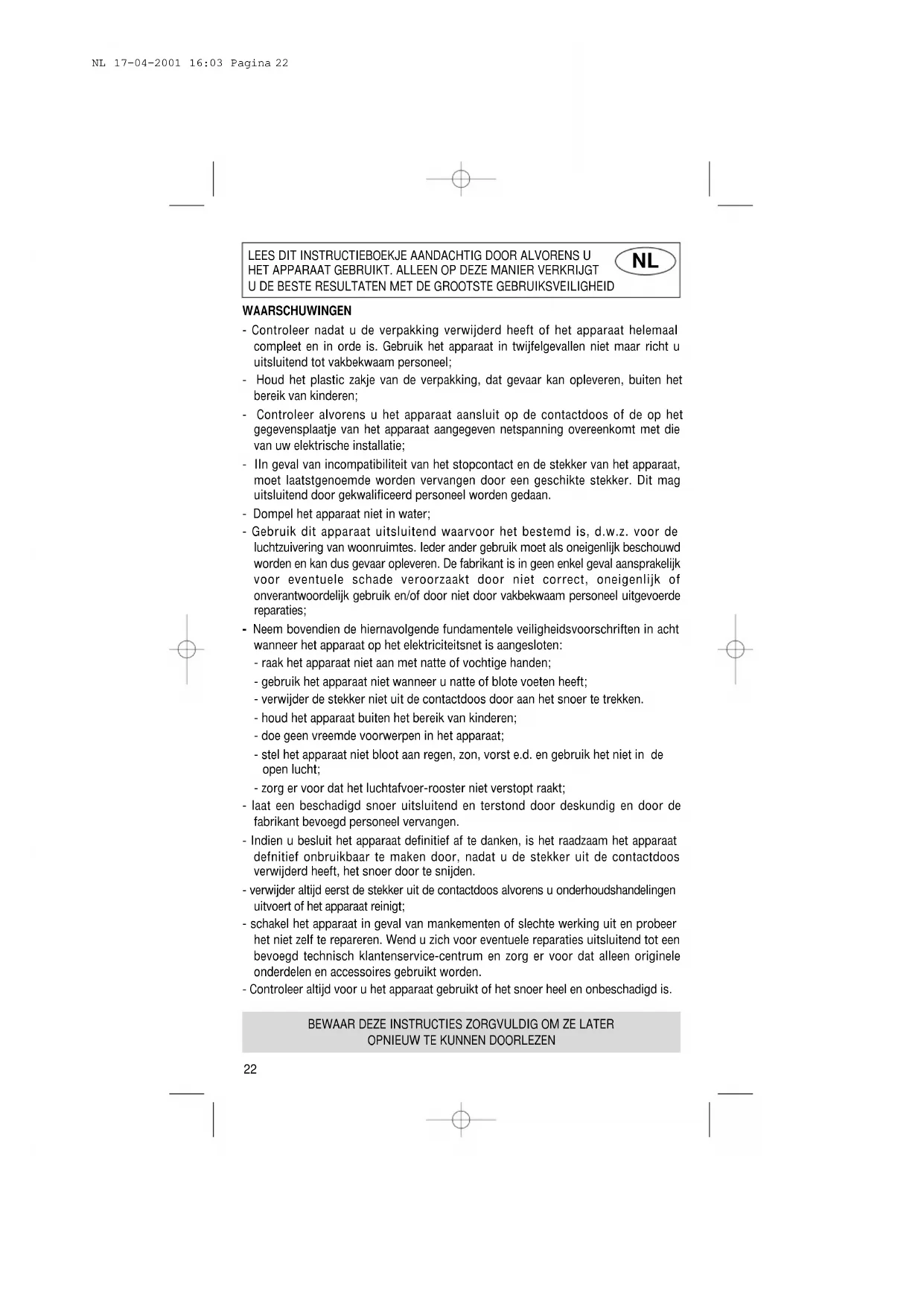 - Pour remplacer les filtres au charbon actif, procédez de la façon suivante : sortir de son logement le filtre usé en le soulevant par une extrémité. Introduire le filtre neuf en le plaçant correctement sous les ailettes. F 17-04-2001 16:03 Pagina 13LEES DIT INSTRUCTIEBOEKJE AANDACHTIG DOOR ALVORENS U HET APPARAAT GEBRUIKT. ALLEEN OP DEZE MANIER VERKRIJGT U DE BESTE RESULTATEN MET DE GROOTSTE GEBRUIKSVEILIGHEID WAARSCHUWINGEN - Controleer nadat u de verpakking verwijderd heeft of het apparaat helemaal compleet en in orde is. Gebruik het apparaat in twijfelgevallen niet maar richt u uitsluitend tot vakbekwaam personeel; - Houd het plastic zakje van de verpakking, dat gevaar kan opleveren, buiten het bereik van kinderen; - Controleer alvorens u het apparaat aansluit op de contactdoos of de op het gegevensplaatje van het apparaat aangegeven netspanning overeenkomt met die van uw elektrische installatie; - IIn geval van incompatibiliteit van het stopcontact en de stekker van het apparaat, moet laatstgenoemde worden vervangen door een geschikte stekker. Dit mag uitsluitend door gekwalificeerd personeel worden gedaan. - Dompel het apparaat niet in water; - Gebruik dit apparaat uitsluitend waarvoor het bestemd is, d.w.z. voor de luchtzuivering van woonruimtes. Ieder ander gebruik moet als oneigenlijk beschouwd worden en kan dus gevaar opleveren. De fabrikant is in geen enkel geval aansprakelijk voor eventuele schade veroorzaakt door niet correct, oneigenlijk of onverantwoordelijk gebruik en/of door niet door vakbekwaam personeel uitgevoerde reparaties; - Neem bovendien de hiernavolgende fundamentele veiligheidsvoorschriften in acht wanneer het apparaat op het elektriciteitsnet is aangesloten: - raak het apparaat niet aan met natte of vochtige handen; - gebruik het apparaat niet wanneer u natte of blote voeten heeft; - verwijder de stekker niet uit de contactdoos door aan het snoer te trekken. - houd het apparaat buiten het bereik van kinderen; - doe geen vreemde voorwerpen in het apparaat; - stel het apparaat niet bloot aan regen, zon, vorst e.d. en gebruik het niet in de open lucht; - zorg er voor dat het luchtafvoer-rooster niet verstopt raakt; - laat een beschadigd snoer uitsluitend en terstond door deskundig en door de fabrikant bevoegd personeel vervangen. - Indien u besluit het apparaat definitief af te danken, is het raadzaam het apparaat defnitief onbruikbaar te maken door, nadat u de stekker uit de contactdoos verwijderd heeft, het snoer door te snijden. - verwijder altijd eerst de stekker uit de contactdoos alvorens u onderhoudshandelingen uitvoert of het apparaat reinigt; - schakel het apparaat in geval van mankementen of slechte werking uit en probeer het niet zelf te repareren. Wend u zich voor eventuele reparaties uitsluitend tot een bevoegd technisch klantenservice-centrum en zorg er voor dat alleen originele onderdelen en accessoires gebruikt worden. - Controleer altijd voor u het apparaat gebruikt of het snoer heel en onbeschadigd is. BEWAAR DEZE INSTRUCTIES ZORGVULDIG OM ZE LATER