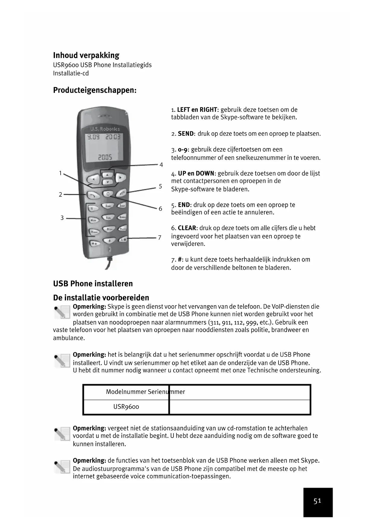 door de verschillende beltonen te bladeren. USB Phone installeren De installatie voorbereiden Opmerking: Skype is geen dienst voor het vervangen van de telefoon. De VoIP-diensten die worden gebruikt in combinatie met de USB Phone kunnen niet worden gebruikt voor het plaatsen van noodoproepen naar alarmnummers (311, 911, 112, 999, etc.). Gebruik een vaste telefoon voor het plaatsen van oproepen naar nooddiensten zoals politie, brandweer en ambulance. Opmerking: het is belangrijk dat u het serienummer opschrijft voordat u de USB Phone installeert. U vindt uw serienummer op het etiket aan de onderzijde van de USB Phone. U hebt dit nummer nodig wanneer u contact opneemt met onze Technische ondersteuning. Opmerking: vergeet niet de stationsaanduiding van uw cd-romstation te achterhalen voordat u met de installatie begint. U hebt deze aanduiding nodig om de software goed te kunnen installeren. Opmerking: de functies van het toetsenblok van de USB Phone werken alleen met Skype. De audiostuurprogramma's van de USB Phone zijn compatibel met de meeste op het internet gebaseerde voice communication-toepassingen. Modelnummer Serienummer USR9600