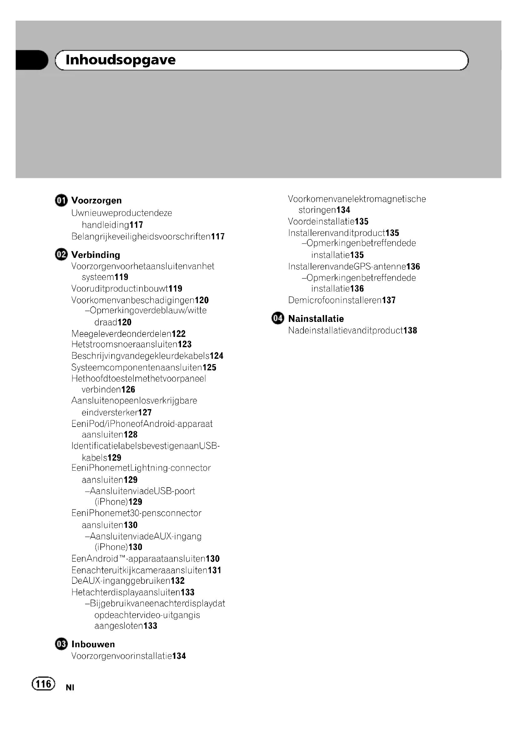 Nach dem EinbauBlack plate (116,1) Voorzorgen Uw nieuwe product en deze handleiding 117 Belangrijke veiligheidsvoorschriften 117 Verbinding Voorzorgen voor het aansluiten van het systeem 119 Voor u dit product inbouwt 119 Voorkomen van beschadigingen 120 – Opmerking over de blauw/witte draad 120 Meegeleverde onderdelen 122 Het stroomsnoer aansluiten 123 Beschrijving van de gekleurde kabels 124 Systeemcomponenten aansluiten 125 Het hoofdtoestel met het voorpaneel verbinden 126 Aansluiten op een los verkrijgbare eindversterker 127 Een iPod/iPhone of Android-apparaat aansluiten 128 Identificatielabels bevestigen aan USB- kabels 129 Een iPhone met Lightning-connector aansluiten 129 – Aansluiten via de USB-poort (iPhone) 129 Een iPhone met 30-pens connector aansluiten 130 – Aansluiten via de AUX-ingang (iPhone) 130 Een Android™-apparaat aansluiten 130 Een achteruitkijkcamera aansluiten 131 De AUX-ingang gebruiken 132 Het achterdisplay aansluiten 133 – Bij gebruik van een achterdisplay dat op de achtervideo-uitgang is aangesloten 133 Inbouwen Voorzorgen voor installatie 134 Voorkomen van elektromagnetische storingen 134 Voor de installatie 135 Installeren van dit product 135 – Opmerkingen betreffende de installatie 135 Installeren van de GPS-antenne 136 – Opmerkingen betreffende de installatie 136 De microfoon installeren 137 Na installatie Na de installatie van dit product 138 <CRD4965-A>116 Inhoudsopgave
