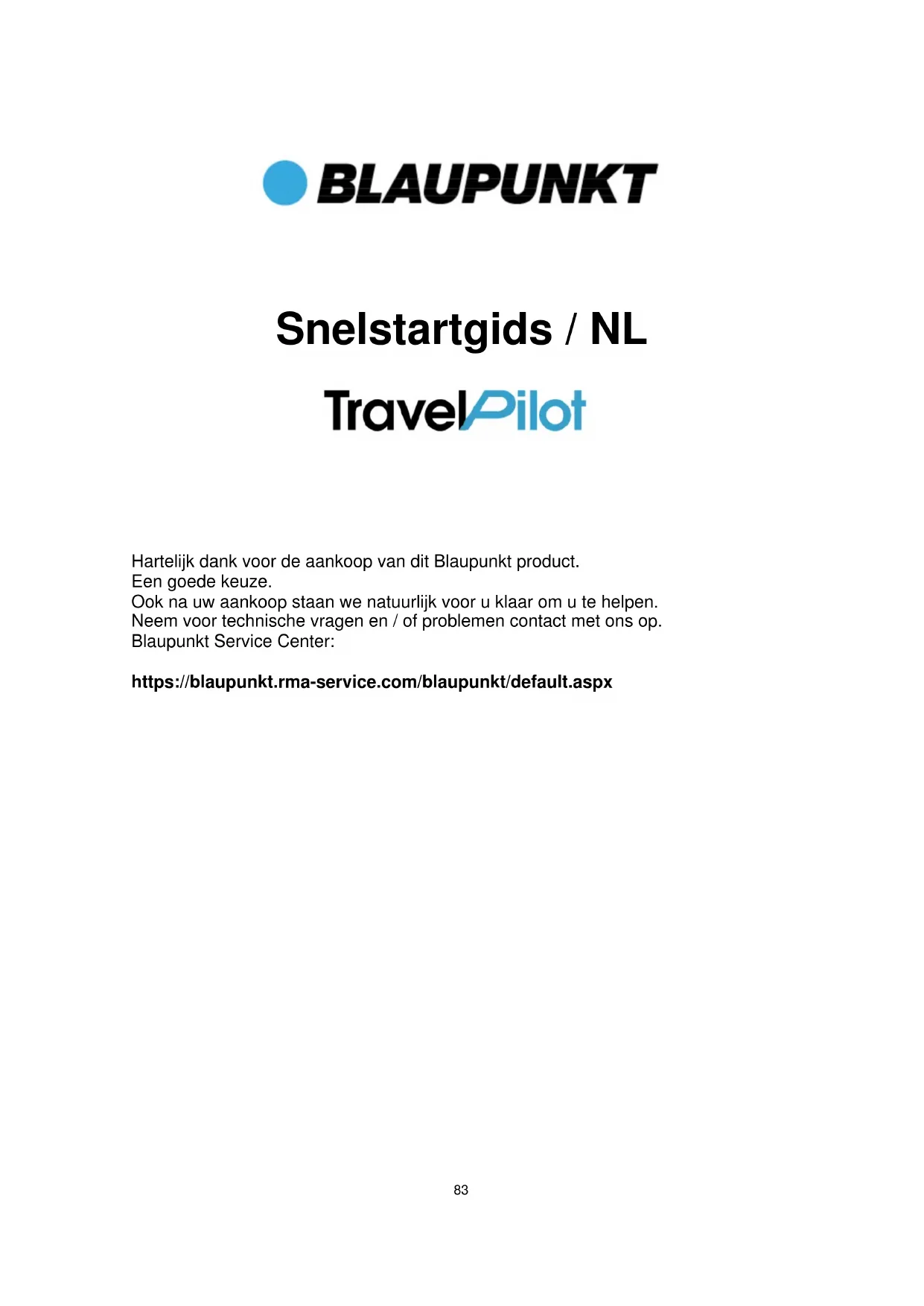 Hartelijk dank voor de aankoop van dit Blaupunkt product. Een goede keuze. Ook na uw aankoop staan we natuurlijk voor u klaar om u te helpen. Neem voor technische vragen en / of problemen contact met ons op. Blaupunkt Service Center: https://blaupunkt.rma-service.com/blaupunkt/default.aspx84 Beste klant, Hartelijk dank dat u gekozen heeft voor een navigatiesysteem van Blaupunkt.