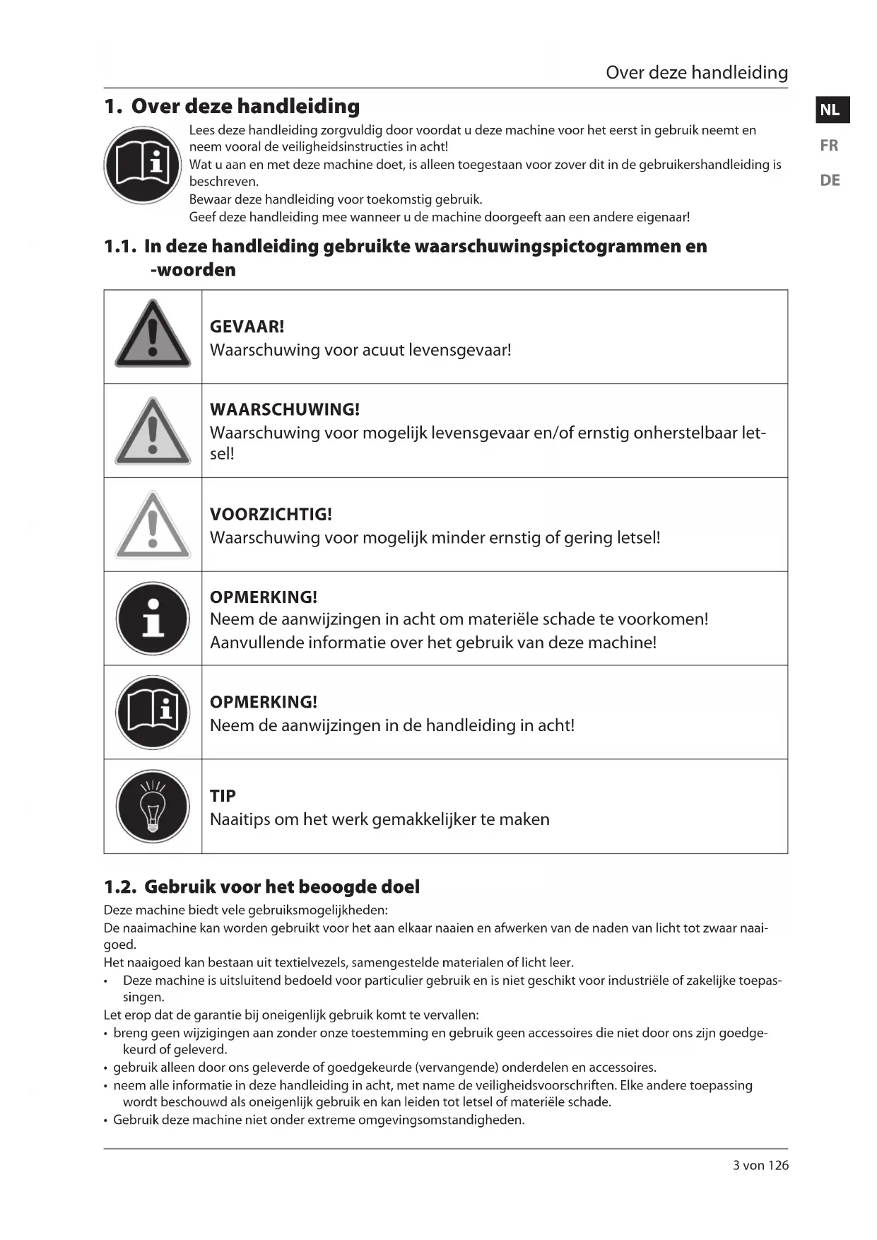 Lees deze handleiding zorgvuldig door voordat u deze machine voor het eerst in gebruik neemt en neem vooral de veiligheidsinstructies in acht! Wat u aan en met deze machine doet, is alleen toegestaan voor zover dit in de gebruikershandleiding is beschreven. Bewaar deze handleiding voor toekomstig gebruik. Geef deze handleiding mee wanneer u de machine doorgeeft aan een andere eigenaar! 1.1. In deze handleiding gebruikte waarschuwingspictogrammen en -woorden GEVAAR! Waarschuwing voor acuut levensgevaar! WAARSCHUWING! Waarschuwing voor mogelijk levensgevaar en/of ernstig onherstelbaar let- sel! VOORZICHTIG! Waarschuwing voor mogelijk minder ernstig of gering letsel! OPMERKING! Neem de aanwijzingen in acht om materiële schade te voorkomen! Aanvullende informatie over het gebruik van deze machine! OPMERKING! Neem de aanwijzingen in de handleiding in acht! TIP Naaitips om het werk gemakkelijker te maken 1.2. Gebruik voor het beoogde doel Deze machine biedt vele gebruiksmogelijkheden: De naaimachine kan worden gebruikt voor het aan elkaar naaien en afwerken van de naden van licht tot zwaar naai- goed. Het naaigoed kan bestaan uit textielvezels, samengestelde materialen of licht leer.