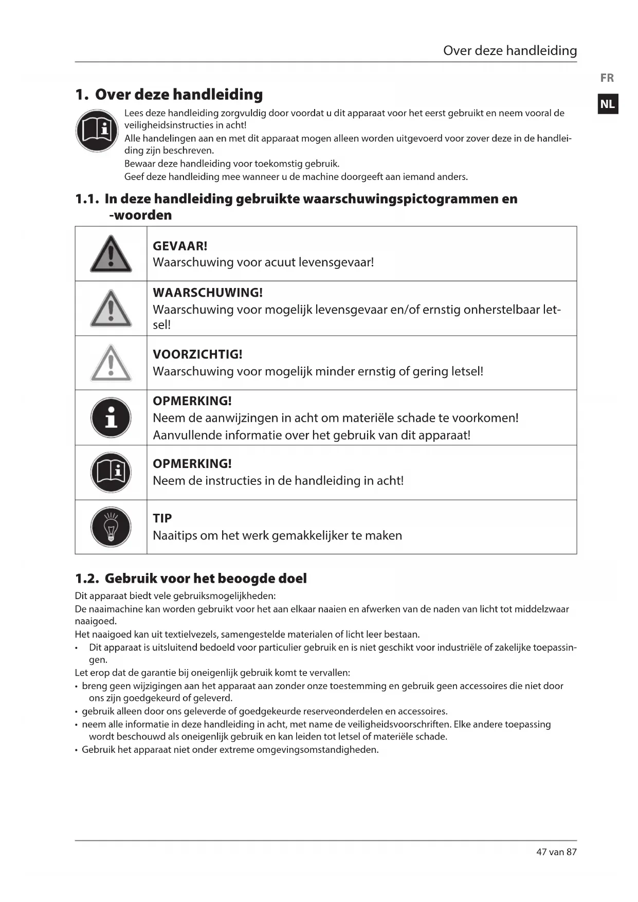 Lees deze handleiding zorgvuldig door voordat u dit apparaat voor het eerst gebruikt en neem vooral de veiligheidsinstructies in acht! Alle handelingen aan en met dit apparaat mogen alleen worden uitgevoerd voor zover deze in de handlei- ding zijn beschreven. Bewaar deze handleiding voor toekomstig gebruik. Geef deze handleiding mee wanneer u de machine doorgeeft aan iemand anders. 1.1. In deze handleiding gebruikte waarschuwingspictogrammen en -woorden GEVAAR! Waarschuwing voor acuut levensgevaar! WAARSCHUWING! Waarschuwing voor mogelijk levensgevaar en/of ernstig onherstelbaar let- sel! VOORZICHTIG! Waarschuwing voor mogelijk minder ernstig of gering letsel! OPMERKING! Neem de aanwijzingen in acht om materiële schade te voorkomen! Aanvullende informatie over het gebruik van dit apparaat! OPMERKING! Neem de instructies in de handleiding in acht! TIP Naaitips om het werk gemakkelijker te maken 1.2. Gebruik voor het beoogde doel Dit apparaat biedt vele gebruiksmogelijkheden: De naaimachine kan worden gebruikt voor het aan elkaar naaien en afwerken van de naden van licht tot middelzwaar naaigoed. Het naaigoed kan uit textielvezels, samengestelde materialen of licht leer bestaan.