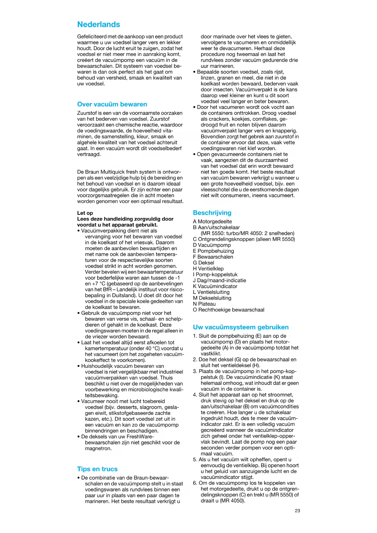 - Open gevacumeerde containers niet te vaak, aangezien dit de duurzaamheid van het voedsel dat erin wordt bewaard niet ten goede komt. Het beste resultaat van vacuüm bewaren verkrijgt u wanneer u een grote hoeveelheid voedsel, bijv. een vleesschotel die u de eerstkomende dagen niet wilt consumeren, ineens vacumeert. Beschrijving A Motorgedeelte B Aan/uitschakelaar (MR 5550: turbo/MR 4050: 2 snelheden) C Ontgrendelingsknoppen (alleen MR 5550) D Vacuümpomp E Pompbehuizing F Bewaarschalen G Deksel H Ventielklep I Pomp-koppelstuk J Dag/maand-indicatie K Vacuümindicator L Ventielsluiting M Dekselsluiting N Plateau O Rechthoekige bewaarschaal Uw vacuümsysteem gebruiken