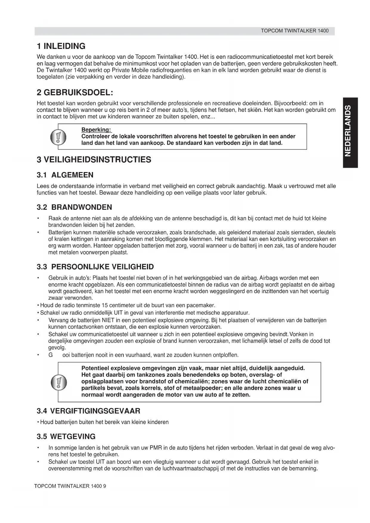 Damage or defects caused by incorrect treatment or operation and damage resulting from use of non-original parts or accessories are not covered by the warranty. The warranty does not cover damage caused by outside factors, such as lightning, water and fire, nor any damage caused during transportation. No warranty can be claimed if the serial number on the unit has been changed, removed or rendered illegal. The CE symbol indicates that the unit complies with the essential requirements of the R&TTE directive.TOPCOM TWINTALKER 1400 9 TOPCOM TWINTALKER 1400 NEDERLANDS 1 INLEIDING We danken u voor de aankoop van de Topcom Twintalker 1400. Het is een radiocommunicatietoestel met kort bereik en laag vermogen dat behalve de minimumkost voor het opladen van de batterijen, geen verdere gebruikskosten heeft. De Twintalker 1400 werkt op Private Mobile radiofrequenties en kan in elk land worden gebruikt waar de dienst is toegelaten (zie verpakking en verder in deze handleiding). 2 GEBRUIKSDOEL: Het toestel kan worden gebruikt voor verschillende professionele en recreatieve doeleinden. Bijvoorbeeld: om in contact te blijven wanneer u op reis bent in 2 of meer auto’s, tijdens het fietsen, het skiën. Het kan worden gebruikt om in contact te blijven met uw kinderen wanneer ze buiten spelen, enz... 3 VEILIGHEIDSINSTRUCTIES