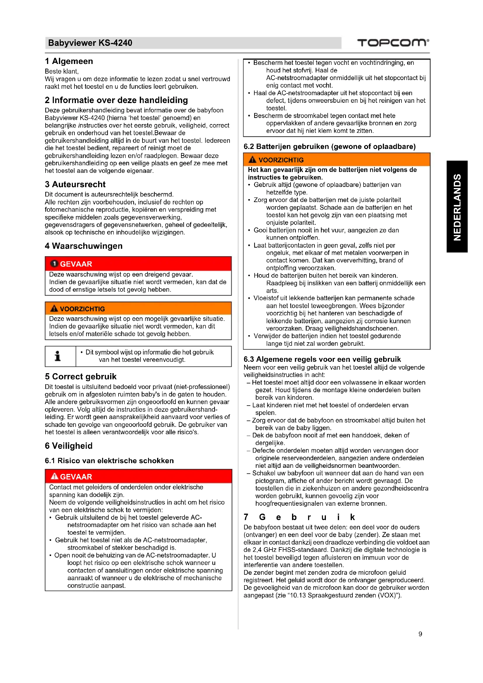 1 Algemeen Beste klant, Wij vragen u om deze informatie te lezen zodat u snel vertrouwd raakt met het toestel en u de functies leert gebruiken. 2 Informatie over deze handleiding Deze gebruikershandleiding bevat informatie over de babyfoon Babyviewer KS-4240 (hierna ‘het toestel’ genoemd) en belangrijke instructies over het eerste gebruik, veiligheid, correct gebruik en onderhoud van het toestel.Bewaar de gebruikershandleiding altijd in de buurt van het toestel. Iedereen die het toestel bedient, repareert of reinigt moet de gebruikershandleiding lezen en/of raadplegen. Bewaar deze gebruikershandleiding op een veilige plaats en geef ze mee met het toestel aan de volgende eigenaar. 3 Auteursrecht Dit document is auteursrechtelijk beschermd. Alle rechten zijn voorbehouden, inclusief de rechten op fotomechanische reproductie, kopiëren en verspreiding met specifieke middelen zoals gegevensverwerking, gegevensdragers of gegevensnetwerken, geheel of gedeeltelijk, alsook op technische en inhoudelijke wijzigingen. 4 Waarschuwingen 5 Correct gebruik Dit toestel is uitsluitend bedoeld voor privaat (niet-professioneel) gebruik om in afgesloten ruimten baby's in de gaten te houden. Alle andere gebruiksvormen zijn ongeoorloofd en kunnen gevaar opleveren. Volg altijd de instructies in deze gebruikershand- leiding. Er wordt geen aansprakelijkheid aanvaard voor verlies of schade ten gevolge van ongeoorloofd gebruik. De gebruiker van het toestel is alleen verantwoordelijk voor alle risico's. 6 Veiligheid