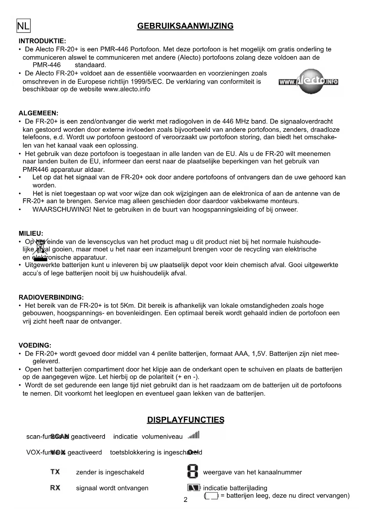 - De Alecto FR-20+ voldoet aan de essentiële voorwaarden en voorzieningen zoals omschreven in de Europese richtlijn 1999/5/EC. De verklaring van conformiteit is beschikbaar op de website www.alecto.info ALGEMEEN: