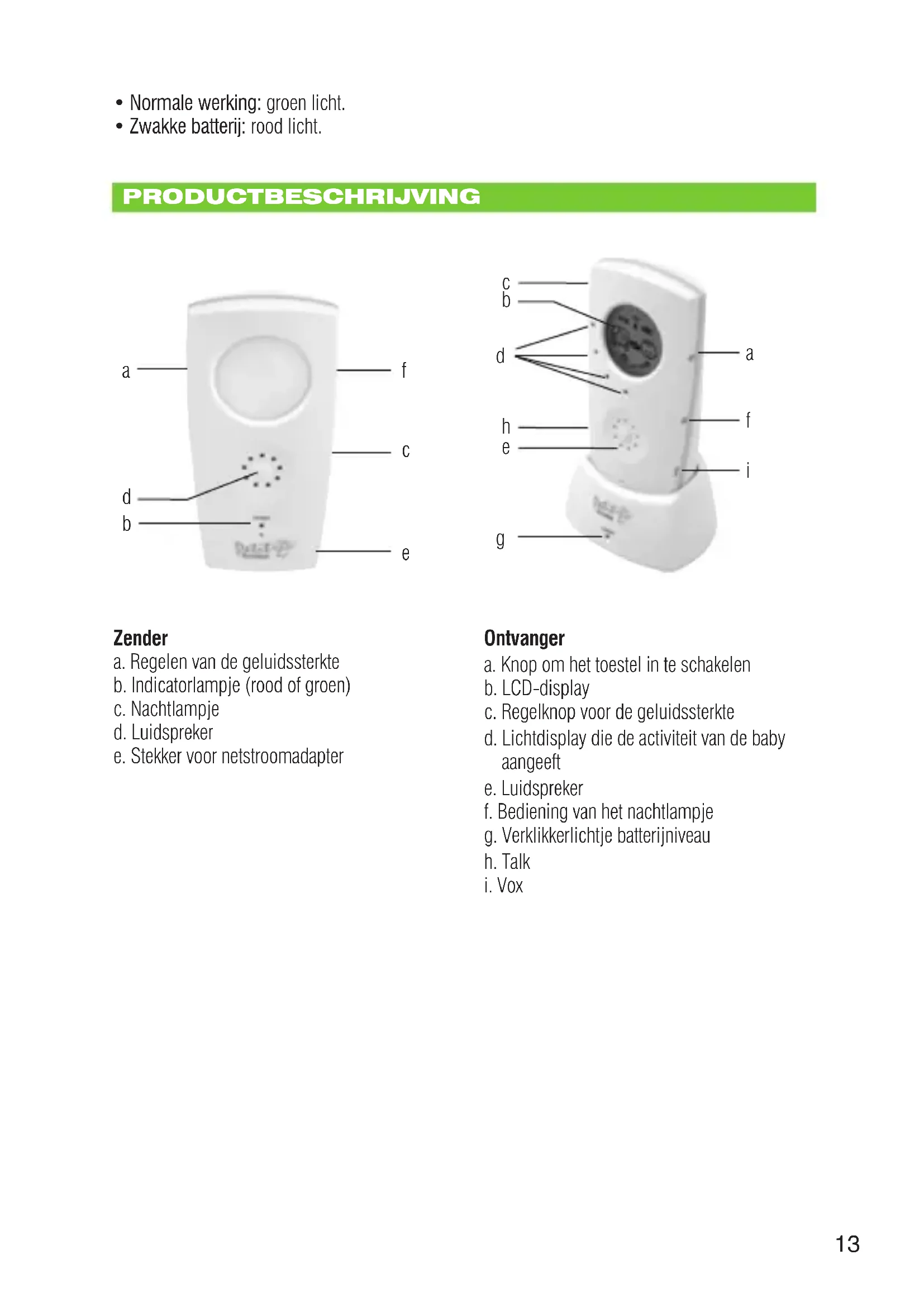 - Probeer het apparaat nooit te demonteren als het snoer beschadigd is of als er andere problemen zijn. Alle reparaties moeten worden uitgevoerd door de fabrikant, de klantenservice van uw leverancier of een erkend vakman. Belangrijk: er klinkt een geluidssignaal als u de ontvanger inschakelt voordat u de zender heeft aangezet. Belangrijk: er klinkt een geluidssignaal als de 2 toestellen niet op hetzelfde kanaal zijn afgesteld. OPGELET: Stel dit toestel niet bloot aan regen of vocht om het risico op elektrische schokken te beperken. Instructies batterijen.13 Zender a. Regelen van de geluidssterkte b. Indicatorlampje (rood of groen) c. Nachtlampje d. Luidspreker e. Stekker voor netstroomadapter Ontvanger a. Knop om het toestel in te schakelen b. LCD-display c. Regelknop voor de geluidssterkte d. Lichtdisplay die de activiteit van de baby aangeeft e. Luidspreker f. Bediening van het nachtlampje g. Verklikkerlichtje batterijniveau h. Talk
