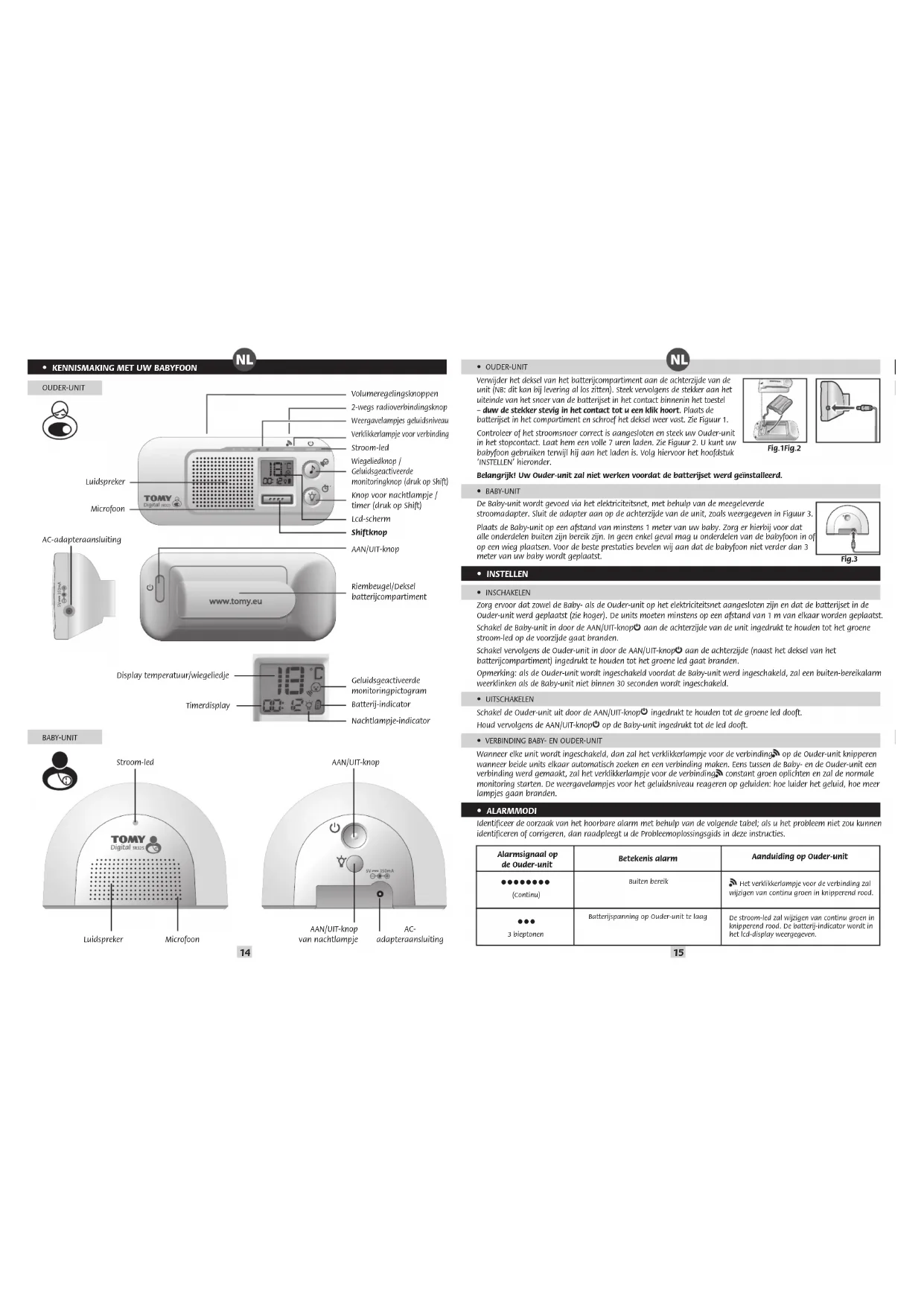 - VEILIGHEIDSINFORMATIE BELANGRIJK! Deze babyfoon is uitsluitend bestemd om binnenshuis te gebruiken! De Tomy Babyfoon is ontworpen als hulp bij het toezicht op uw kind en vervangt het toezicht door een volwassene niet. Dit product is geen speelgoed. Houd elektrische toestellen en hun netsnoeren altijd buiten bereik van baby’s en jonge kinderen. Belangrijk: plaats nooit een of ander onderdeel van uw babyfoon in of op het bedje. Zorg ervoor dat bedrading veilig weggewerkt is zodat kinderen er niet in verstrikt geraken of erover kunnen struikelen. De adapters die met deze babyfoon worden meegeleverd, mogen nooit met andere toestellen gebruikt worden. Gebruik voor deze babyfoon nooit andere dan de meegeleverde adapters. Plaats de adapter nergens waar een kleuter hem als opstapje zou kunnen gebruiken. Gewicht op een ingeplugde adapter kan de unit beschadigen maar kan ook verwondingen veroorzaken. Het is normaal dat laders heet worden tijdens het gebruik. Wees voorzichtig; geef hitte de kans zich te verspreiden. NIET AFDEKKEN! Ontkoppel de lader indien het product enkele dagen niet gebruikt wordt. Voorkom elektrische schokken: haal de stekker uit het stopcontact vóór het schoonmaken. De oplaadbare batterij in de Ouder-unit moet gerecycleerd worden. Niet weggooien met gewoon afval. Probeer geen onderdelen uit elkaar te halen.
