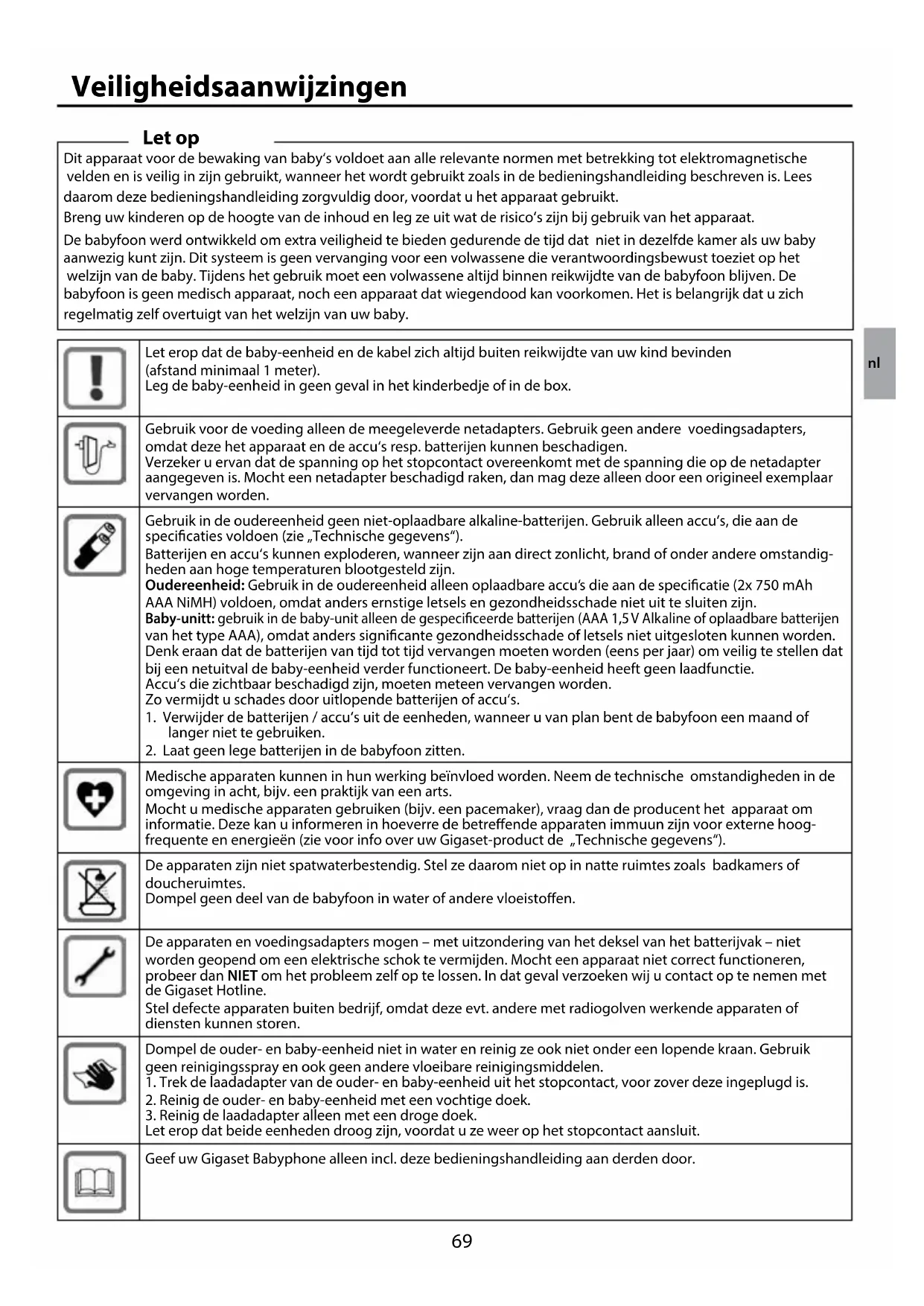 Medische apparaten kunnen in hun werking beïnvloed worden. Neem de technische omstandigheden in de omgeving in acht, bijv. een praktijk van een arts. Mocht u medische apparaten gebruiken (bijv. een pacemaker), vraag dan de producent het apparaat om informatie. Deze kan u informeren in hoeverre de betreende apparaten immuun zijn voor externe hoog- frequente en energieën (zie voor info over uw Gigaset-product de „Technische gegevens“). De apparaten zijn niet spatwaterbestendig. Stel ze daarom niet op in natte ruimtes zoals badkamers of doucheruimtes. Dompel geen deel van de babyfoon in water of andere vloeistoen. De apparaten en voedingsadapters mogen – met uitzondering van het deksel van het batterijvak– niet worden geopend om een elektrische schok te vermijden. Mocht een apparaat niet correct functioneren, probeer dan NIET om het probleem zelf op te lossen. In dat geval verzoeken wij u contact op te nemen met de Gigaset Hotline. Stel defecte apparaten buiten bedrijf, omdat deze evt. andere met radiogolven werkende apparaten of diensten kunnen storen. Dompel de ouder- en baby-eenheid niet in water en reinig ze ook niet onder een lopende kraan. Gebruik geen reinigingsspray en ook geen andere vloeibare reinigingsmiddelen.