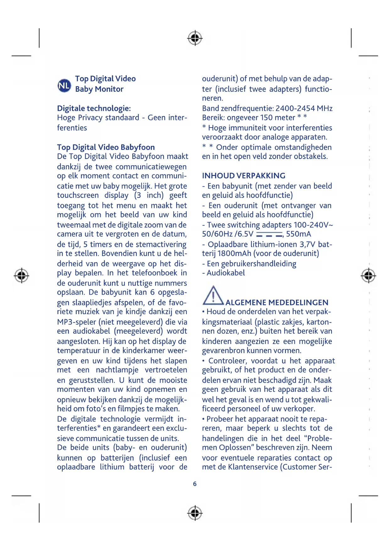 - * Onder optimale omstandigheden en in het open veld zonder obstakels. INHOUD VERPAKKING - Een babyunit (met zender van beeld en geluid als hoofdfunctie) - Een ouderunit (met ontvanger van beeld en geluid als hoofdfunctie) - Twee switching adapters 100-240V~ 50/60Hz /6.5V , 550mA - Oplaadbare lithium-ionen 3,7V bat- terij 1800mAh (voor de ouderunit) - Een gebruikershandleiding - Audiokabel ALGEMENE MEDEDELINGEN